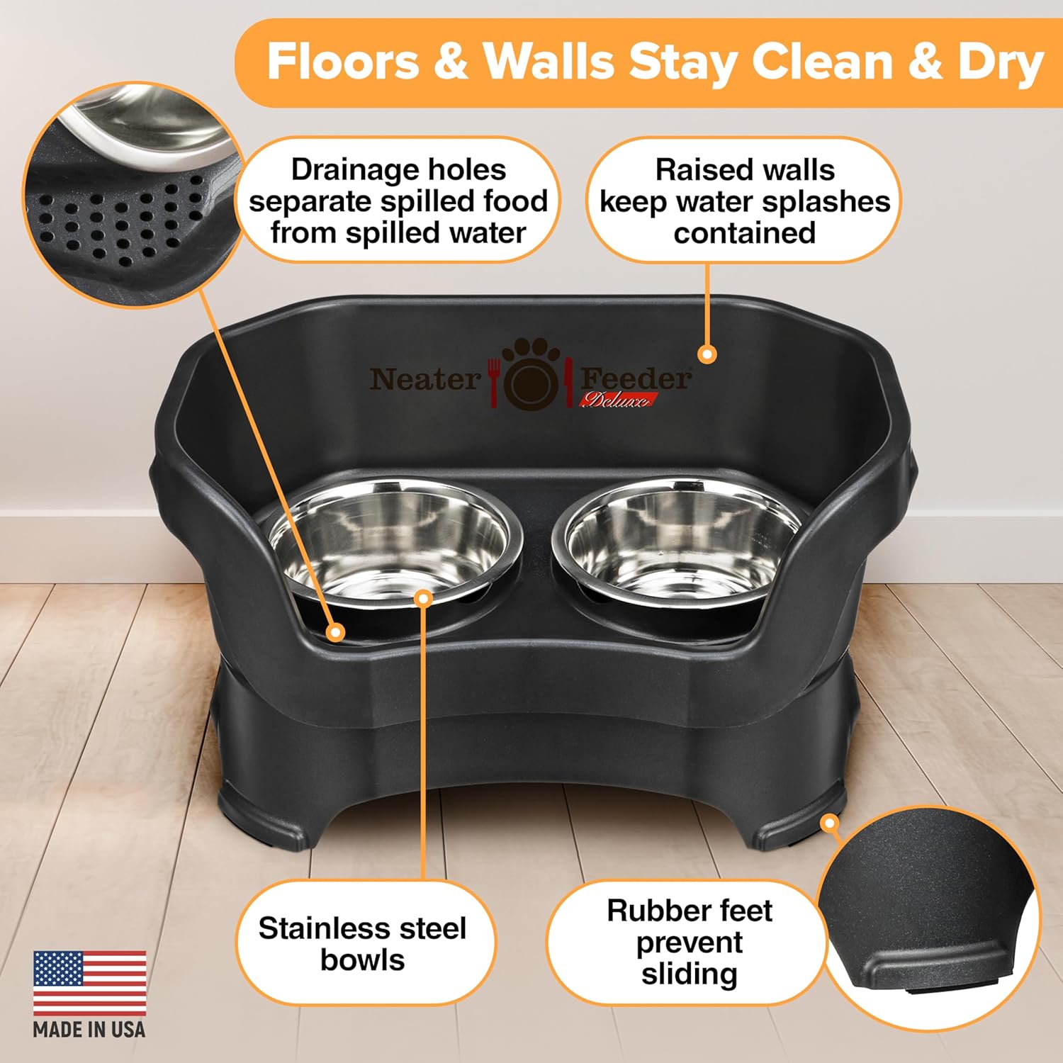 Neater Feeder Deluxe Mess Proof Dog Bowls Elevated Medium Sized Dog Breed – Made in USA – No Spill Raised Dog Food Bowl Stand – Stainless Steel Food and Water Bowl Set, Pet Feeding Station, Black