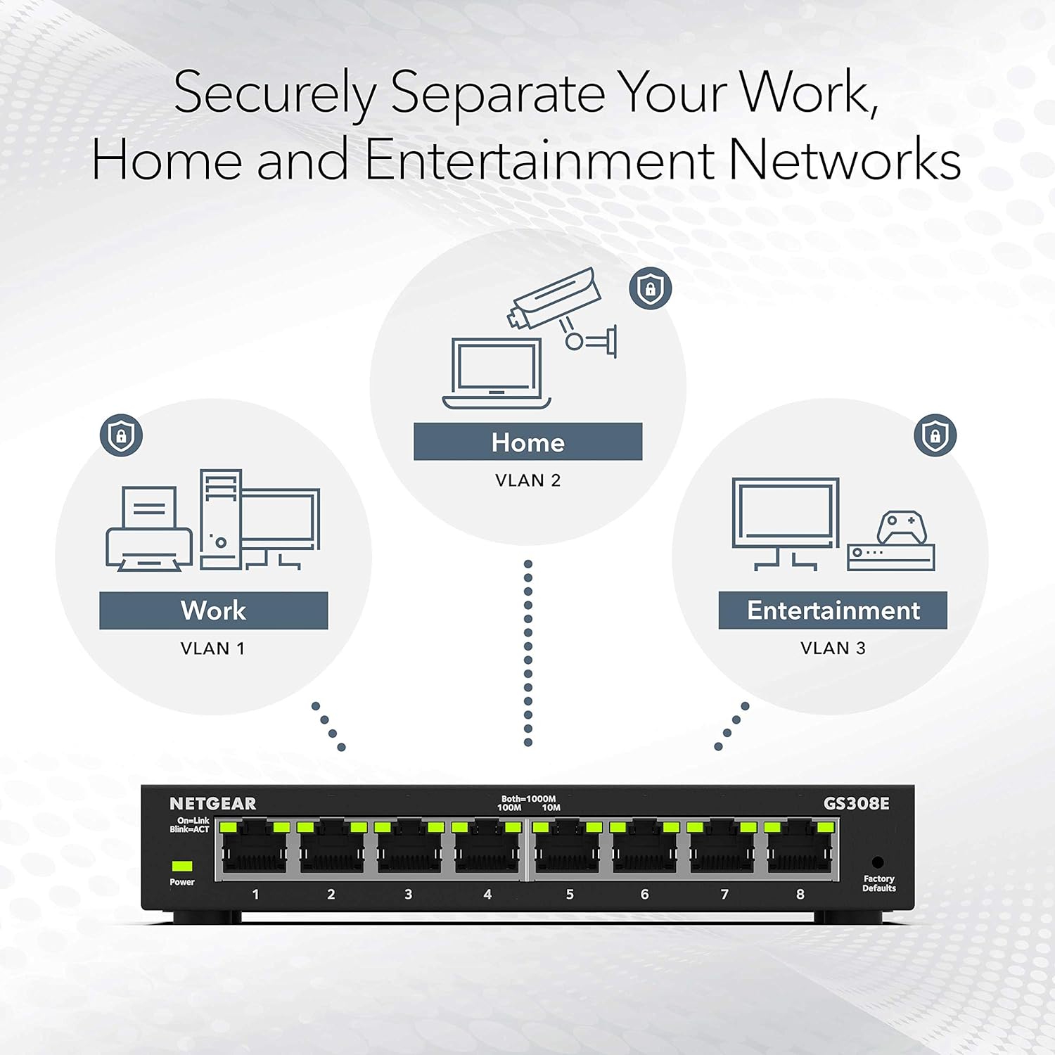 NETGEAR 8-Port Gigabit Ethernet Easy Smart Managed Essentials Switch (GS308E) – Desktop or Wall Mount, Home Network Hub, Office Ethernet Splitter, Silent Operation