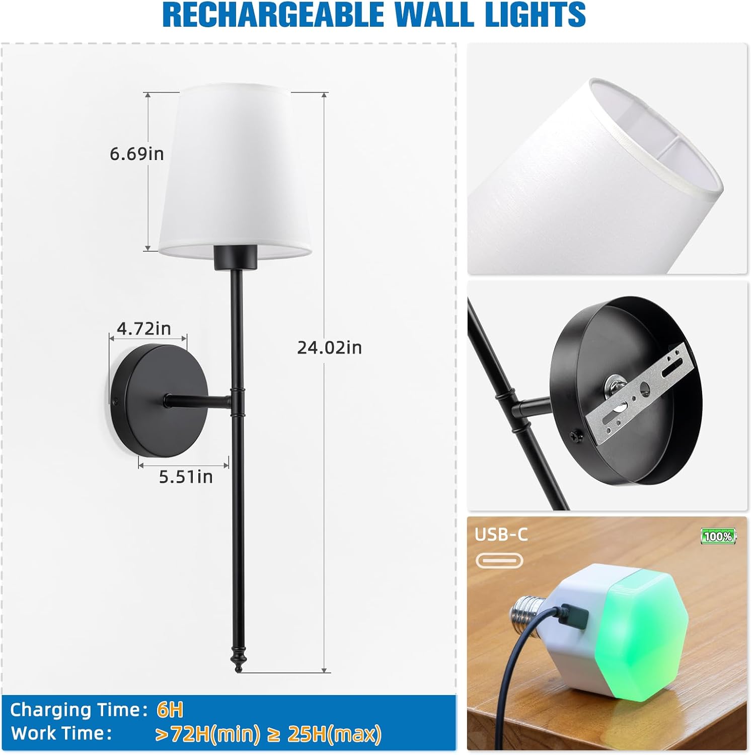 【Wireless & Easy to Install】NIORSUN wall sconces set of two battery operated comes with two 300 lumen, 5200 mAh E26 rechargeable bulbs. It can work 25H for highest brightness, 72H for low brightness fully charged.Our rechargeable wall sconce redefine convenience with their easy installation, no wiring required. With a sleek and contemporary design, these sconces effortlessly blend into any indoor space, providing both functionality and style.