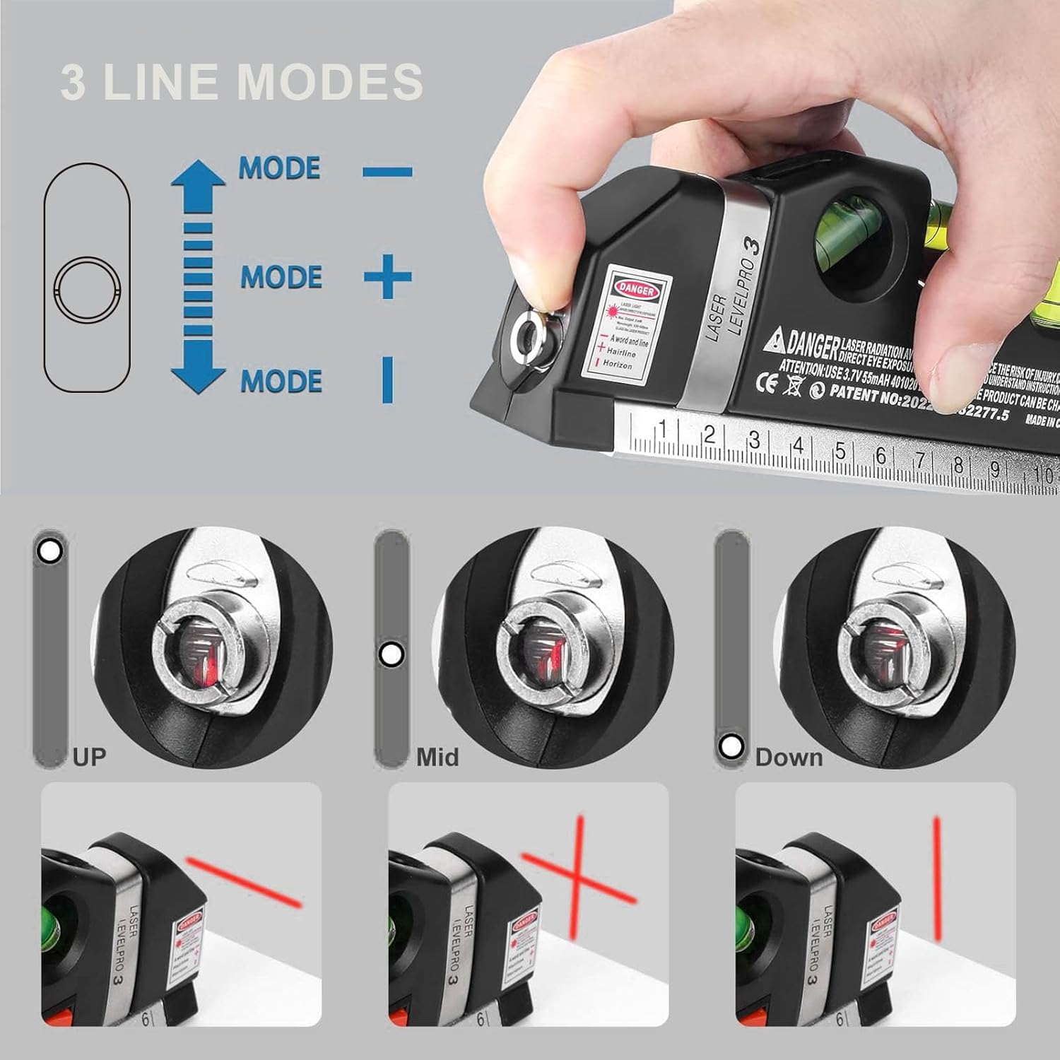 Easy to operate-Laser leveler tool herramientasis designed with one slider selection button in the front to make it easy for everyone to use.It control the vertical laser line, horizontal laser line and cross laser line mode switching.
