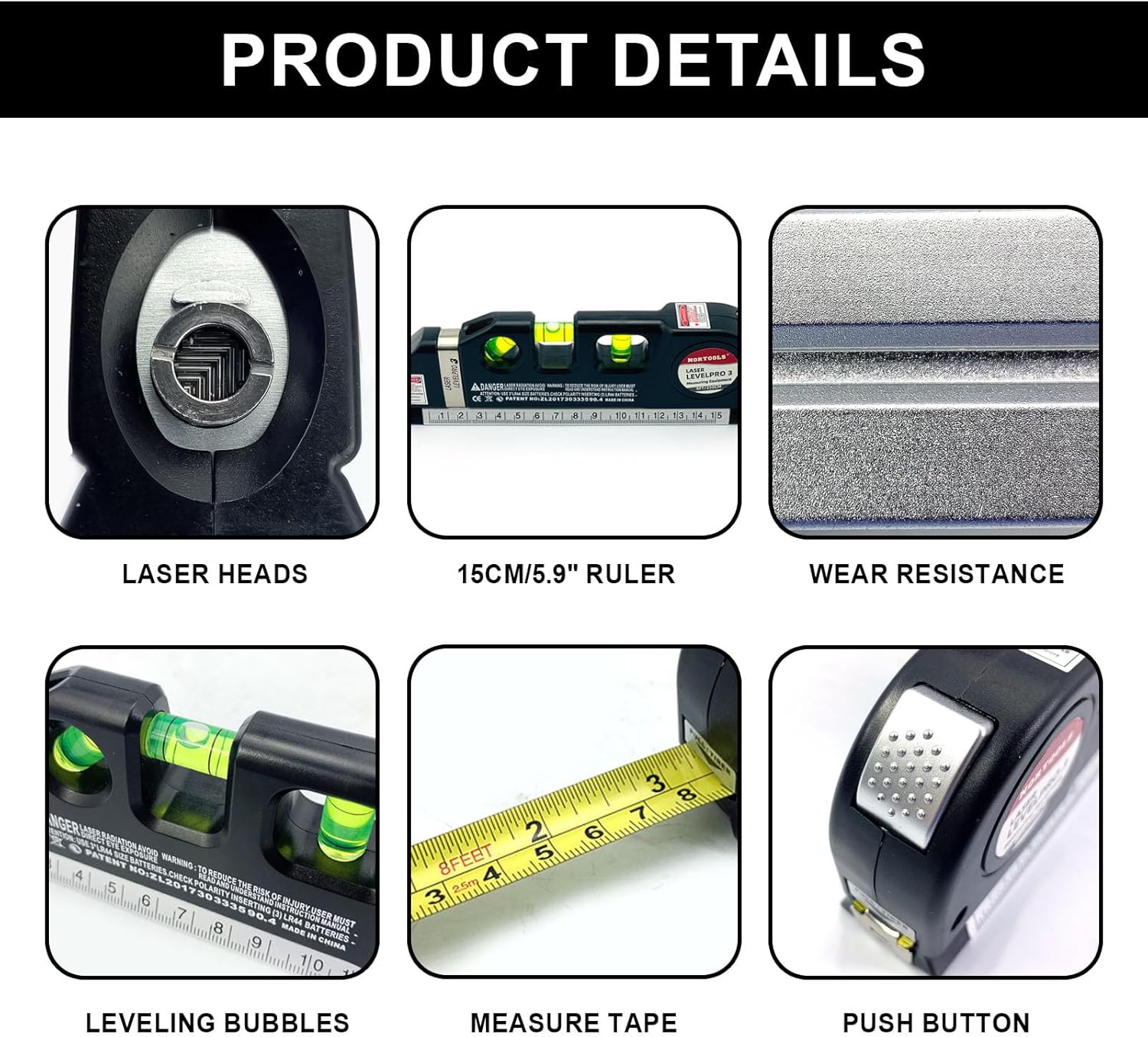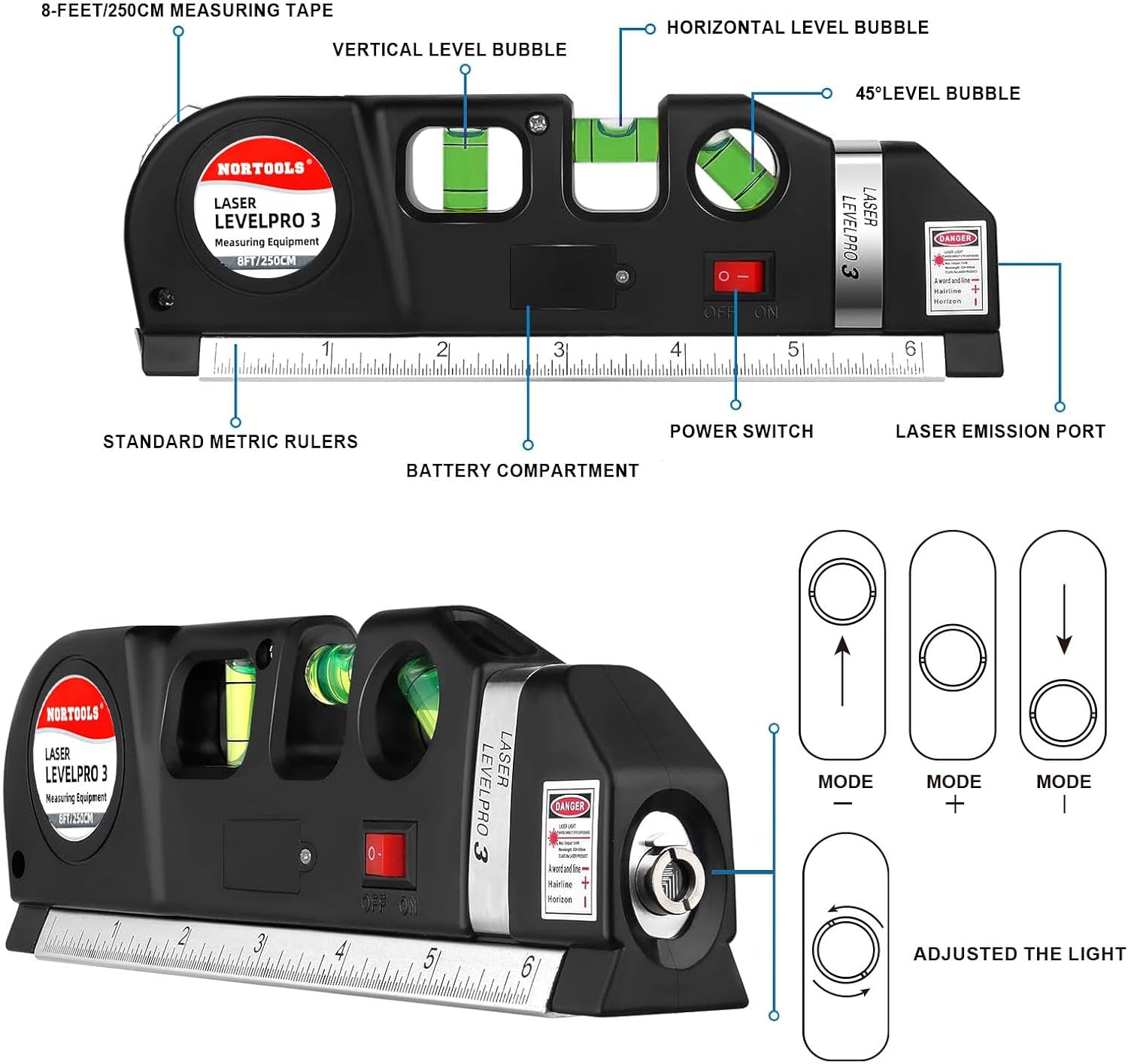 NORTOOL Laser Level, Multipurpose Cross Line Kit with Metric Rulers 8FT/2.5M 4-in-1 Laser Level Line tools for Construction, Home Renovation,Picture Hanging Cabinets
