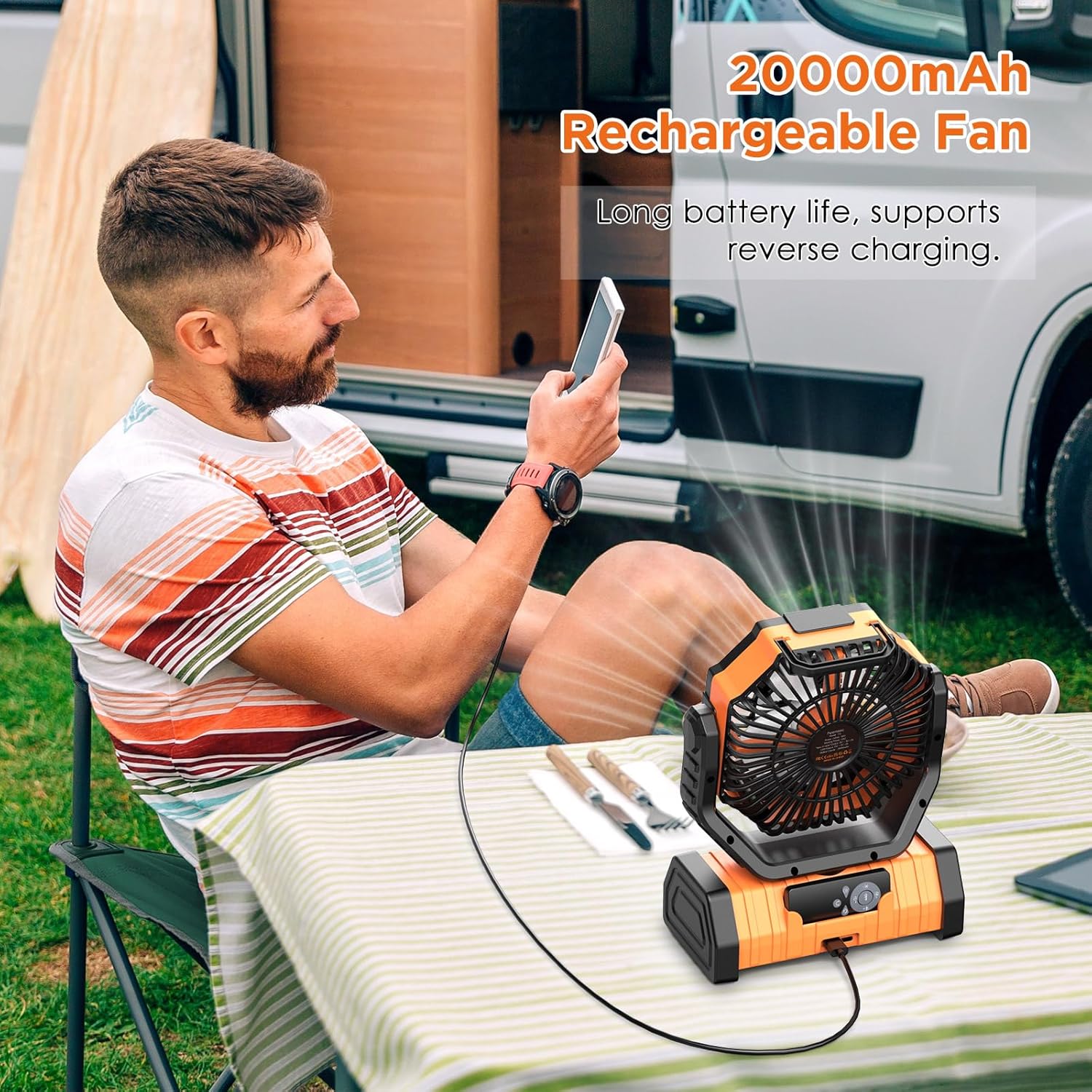 20,000mAh Long-lasting Battery for Camping & Travel Essentials: Experience ultimate convenience with this portable fan, battery powered fan, and rechargeable fan (ventilador recargable)—a must-have for camping essentials and travel essentials. With 12–138hrs runtime, it’s perfect for camping fans, car camping, and emergency use. Dual charging ports allow you to charge two devices while enjoying the cooling breeze