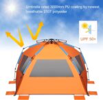 Easy Setup and Portable – This instant beach tent pop up mechanism, makes it fast and easy to take down and fold back in under 30 seconds. Light weight at 5 lbs, packs down to 35″ x 5.5″ for easy carrying and storage.