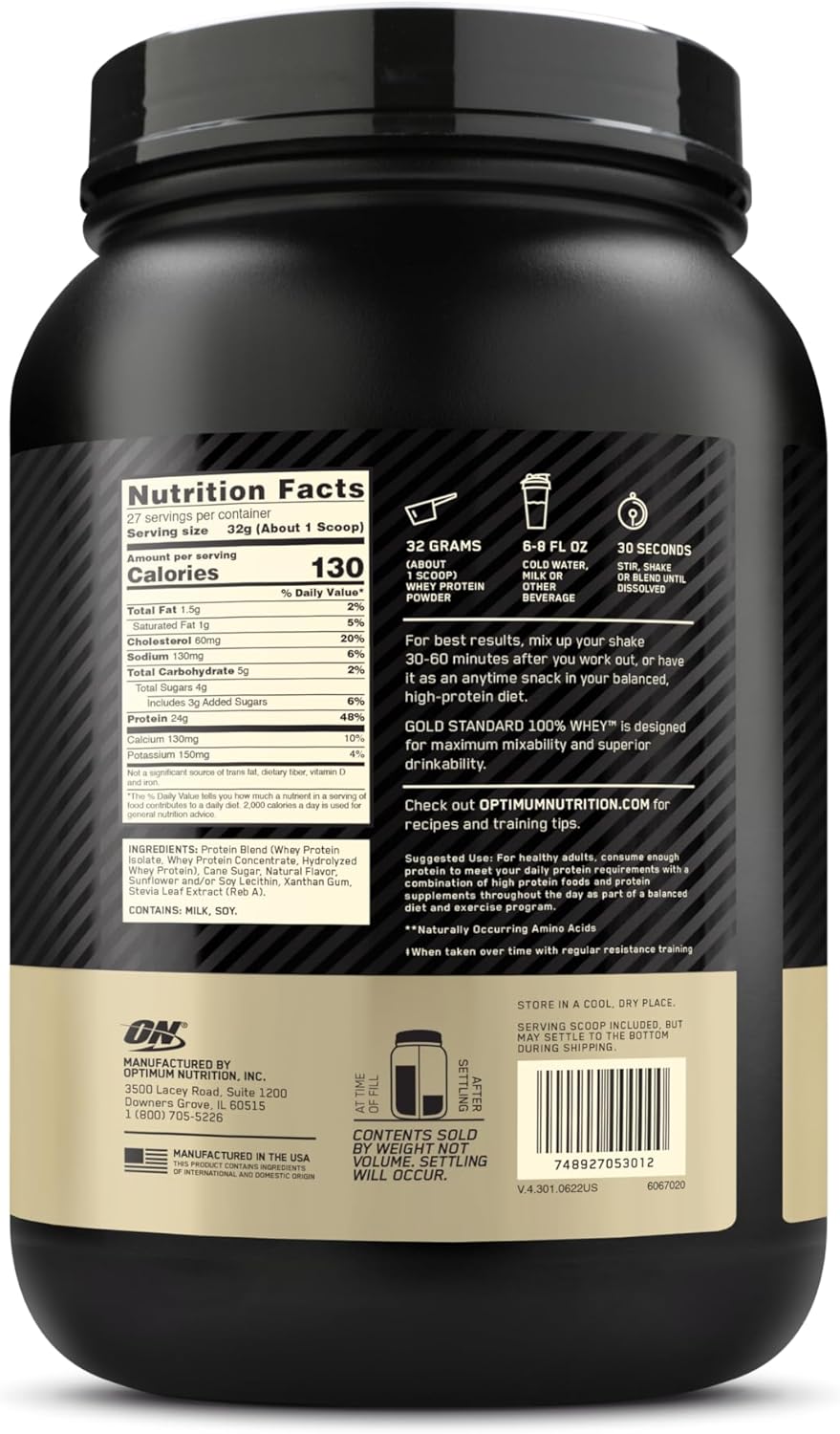 GOLD STANDARD 100% WHEY BLEND – 24g blended protein consisting of whey protein isolate, whey protein concentrate, and whey peptides to support lean muscle mass – they don’t call it the GOLD STANDARD of quality for nothing