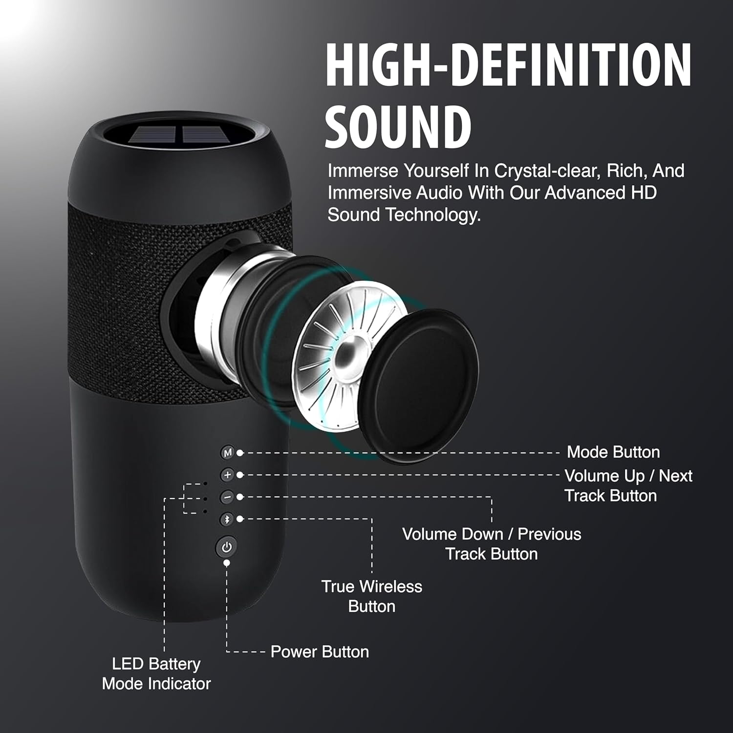 SOLAR POWERED EFFICIENCY: Embrace sustainable technology with our speakers! Built-in solar panels charge the batteries during the day, eliminating the need for power outlets or constant battery changes. Enjoy up to 6 hours of playtime on a single charge with the solar panel speaker, which charges at a rate of 40mAh/H through its solar panel.