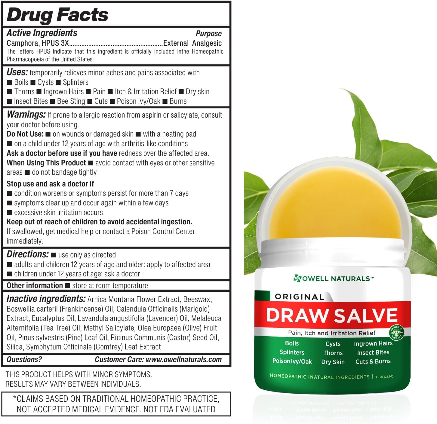 OWELL Naturals Drawing Salve Ointment 1oz, ingrown Hair, Boil, Splinter Remover, Bug Spider Bites, bee Sting, Mosquito bite Itch, Poison Ivy