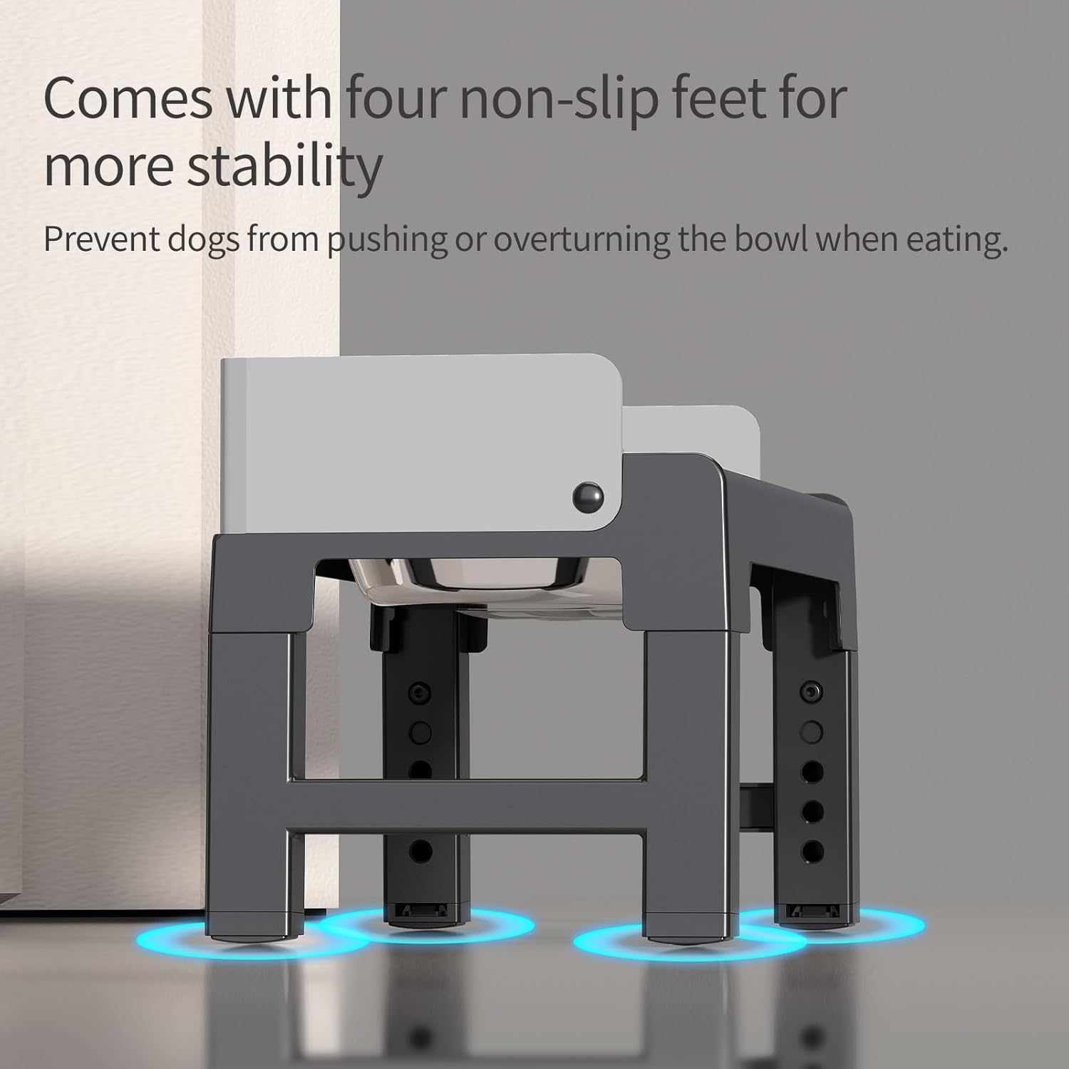 ANTI-SKID PADS & NO INSTALLATION: The anti-skid foot pads on our elevated dog bowl stand ensure the bowls and stand stay stable even during vigorous eating. No assembly required. Simply unfold the legs and press down to use. Adjusting the height is a breeze too, just press the black button and pull the legs to your desired height.