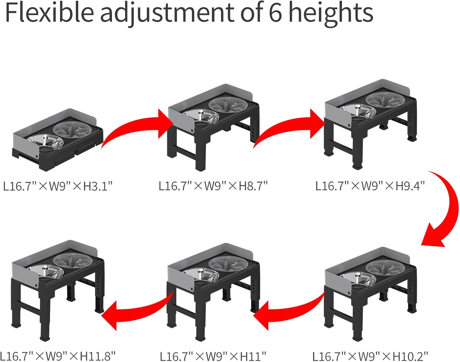 ADJUSTABLE STAND WITH SIX HEIGHTS: PAKEWAY dog bowl stand can be adjusted to 6 height: 3.1-inch, 8.7-inch, 9.4-inch, 10.2-inch, 11-inch and 11.8-inch. Allows dogs to find the most comfortable way to eat without having to put their head down to eat and drink.