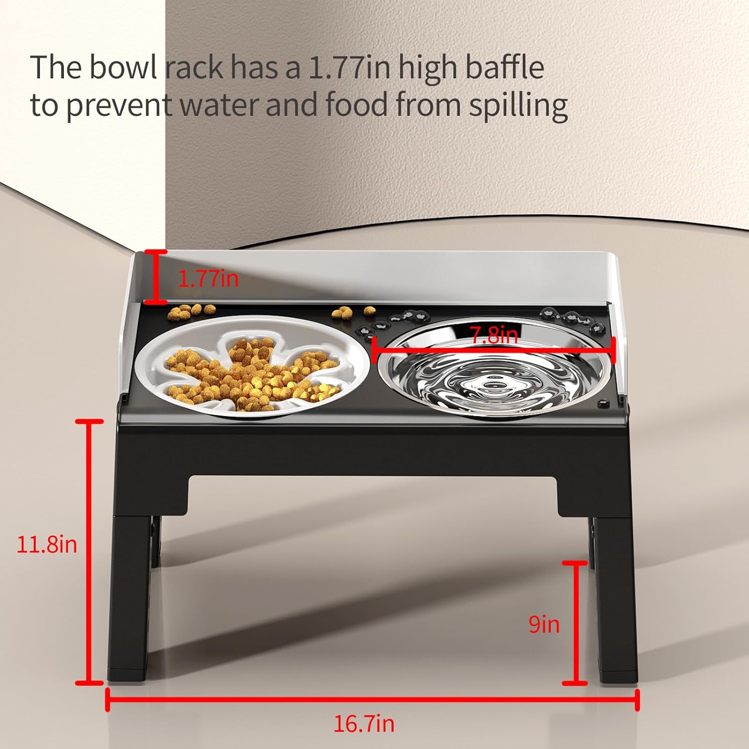 KEEP WALLS AND FLOORS CLEAN: We have designed a 1.77-inch baffle at the back of the feeder to ensure that it prevents food and water from spilling while also ensuring the overall aesthetics of the product. This baffle effectively prevents most dogs from splashing water and food while eating, ensuring that the water and food will be left on the dish rack without staining the walls and floors!