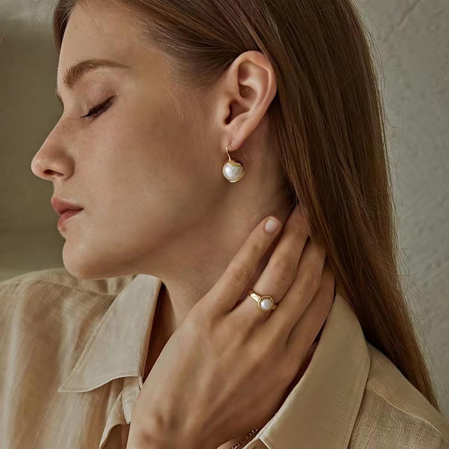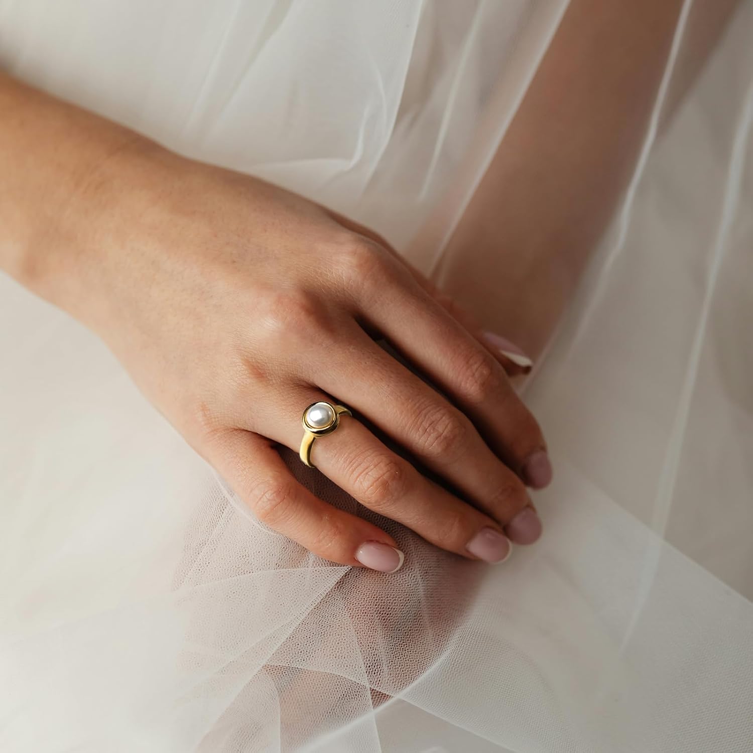 Pearl Ring for Women, 18K Gold Plated Rings for Bride Wedding Engagement Band Birthday Jewelry for Women Fits Sizes 5 to 11