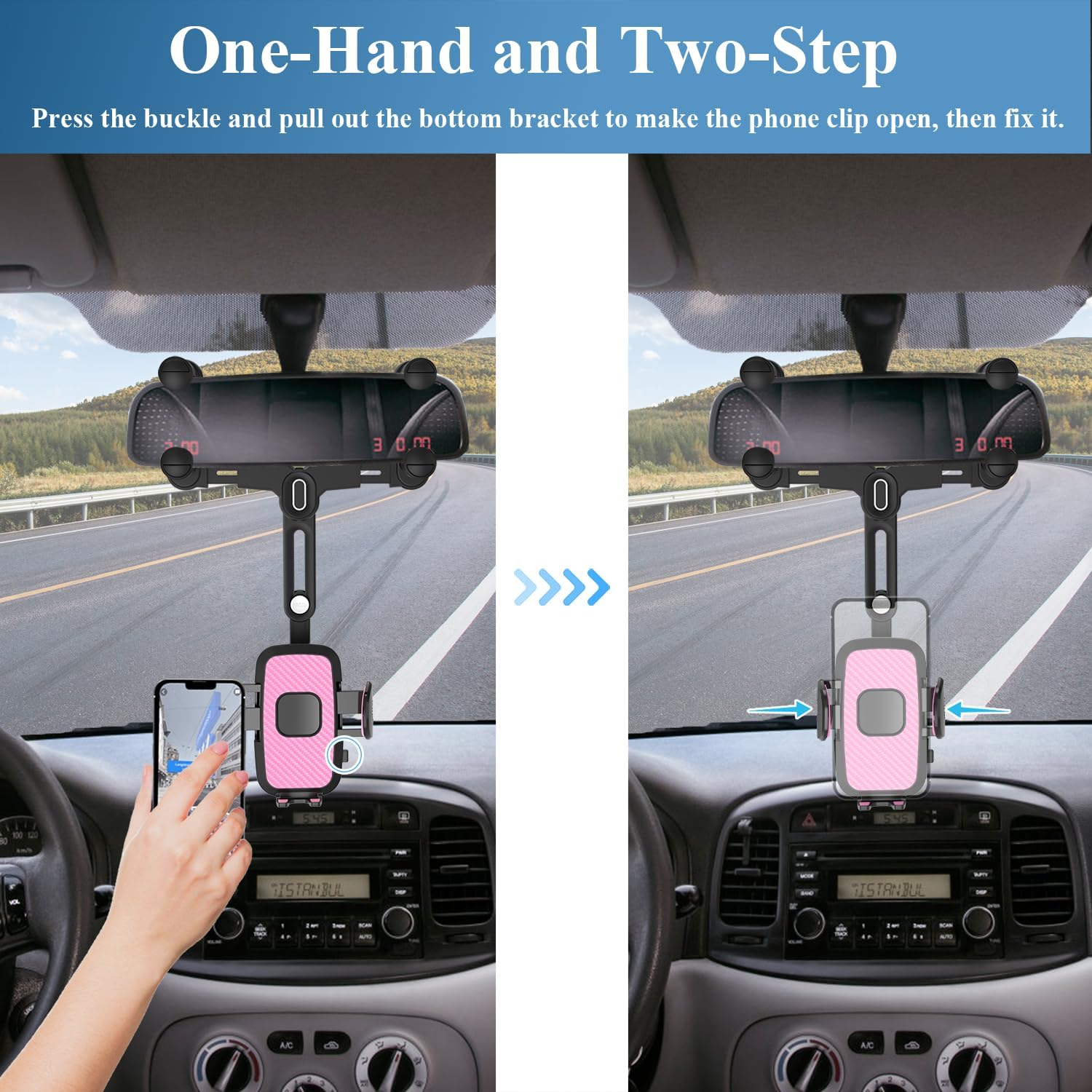 Phone Mount for Car, Rear View Mirror Phone Holder, Rotatable and Retractable Car Phone Holder Mount Rearview Mirror Phone Holder for Car Compatible with iPhone Samsung Cell Phones (Pink)