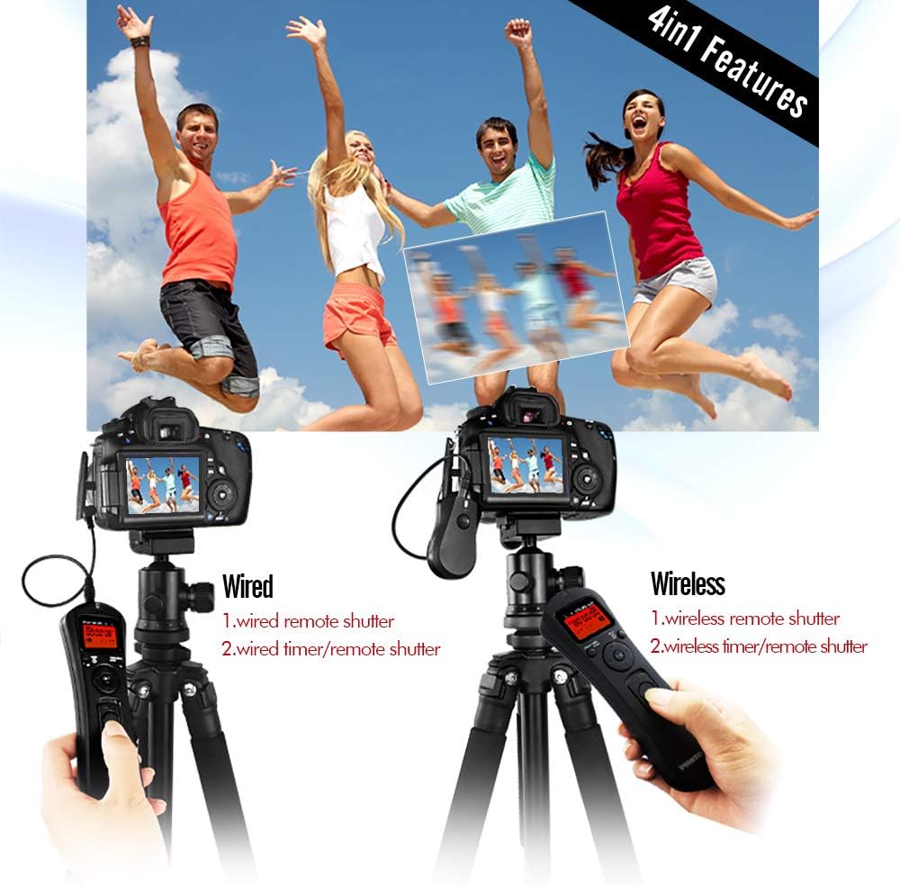 Anti-vibration: With wired or wireless remote control, it can avoid damaging image integrity and quality caused by camera vibration when you press camera shutter button.FSK 2.4GHz Wireless Control System: Using international 2.4G transmission technology, it’s stable and quick response to shutter.Timer Functions:Timer Schedule Delay, Timer Schedule Exposure Time, Timer Shooting Number of Shots, Repeat Timer Schedule Interval Time, Repeat Timer Schedule Times.Shutter Functions: Single Shooting, BULB Shooting, Delay Shooting. Low-consumption LCD Screen: We uses low-consumption LCD panel to reduce its power consumption and extend working time greatly.it’s easy and clear to handle.