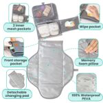 Generously Sized yet Compact: Organized baby essentials with 2 inner mesh pockets, front storage bag (key holder and outer pocket), and easy-access wipes holder. Experience hassle-free diaper changes blending versatility and comfort. Our diaper changing mat is padded with a soft memory foam pillow. You can detach this extra storage space when you just need a simple changing pad! Equipped with a spacious 27” by 22” changing area, it folds into a compact 8″ by 11″ clutch for easy storage.