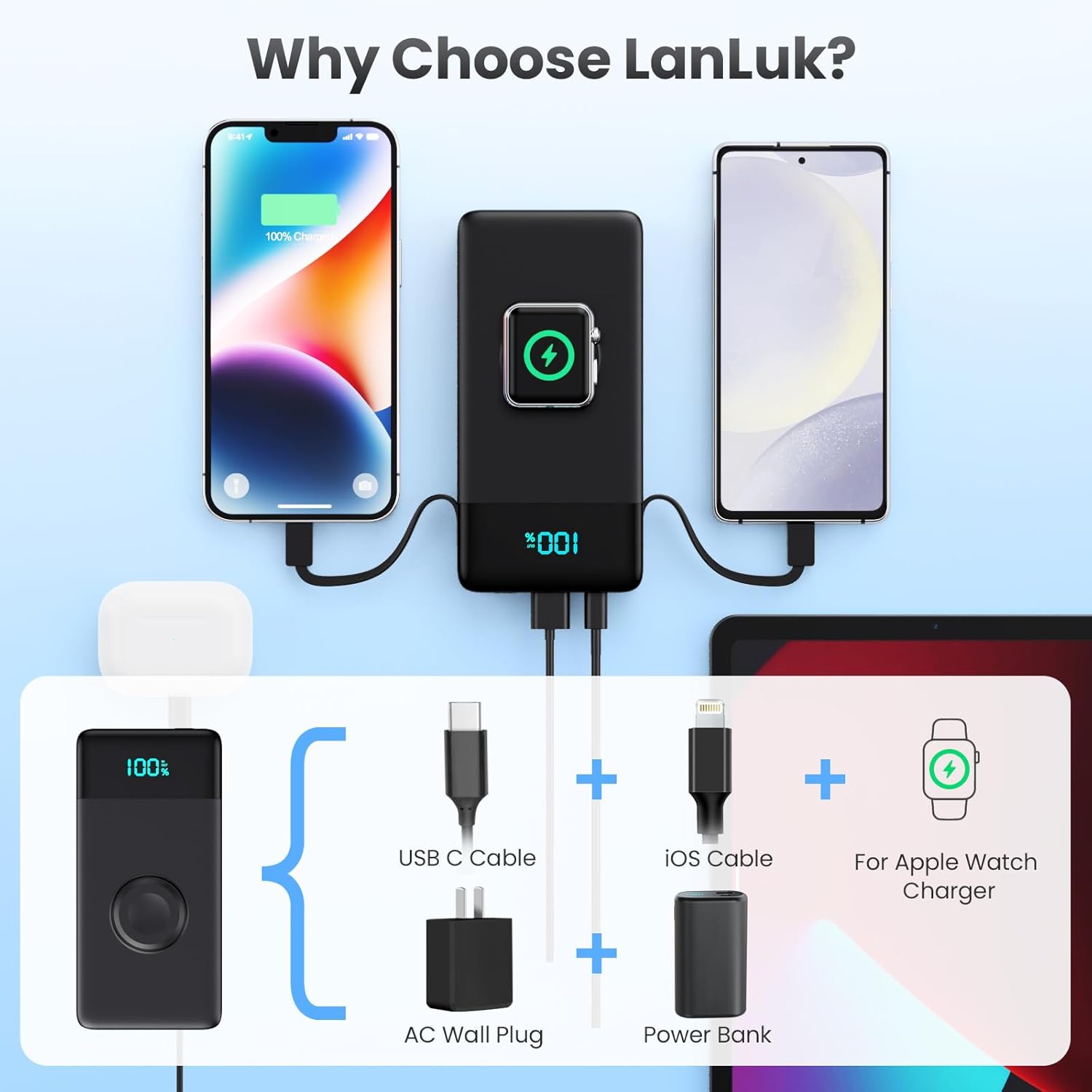 【Real 10800mAh Power Bank Charger with LCD Display】The power bank with a powerful 10800mAh capacity can offer about 2 charges for the iPhone 16/15/14/13/12, up to 25 charges for iWatch, 1.2 charges for iPad. Intuitive LCD digital display screen make the remaining power management clearly visible.