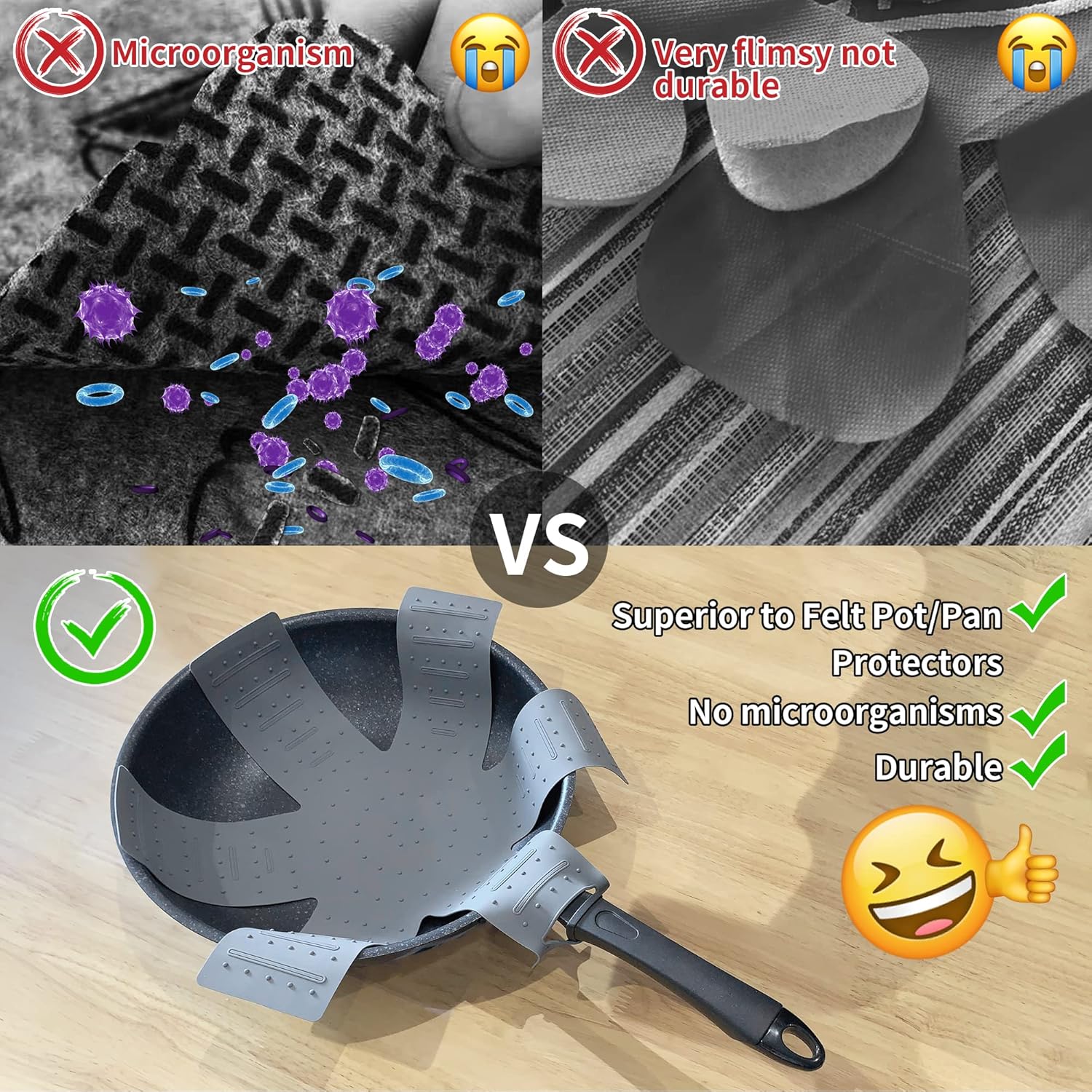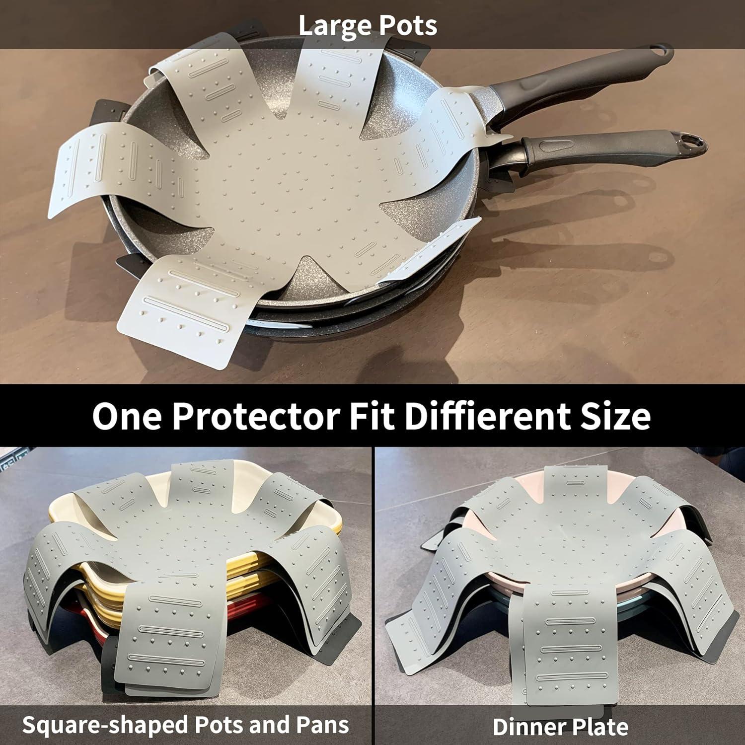 [Bigger Size]: The pot protector can fit from small to large pots and pans and round and square pot or pans, larger and wider for better protection of your pots and pans, perfect for 3 silicone pot protectors. Also, you can fold or cut to size to fit your kitchen.