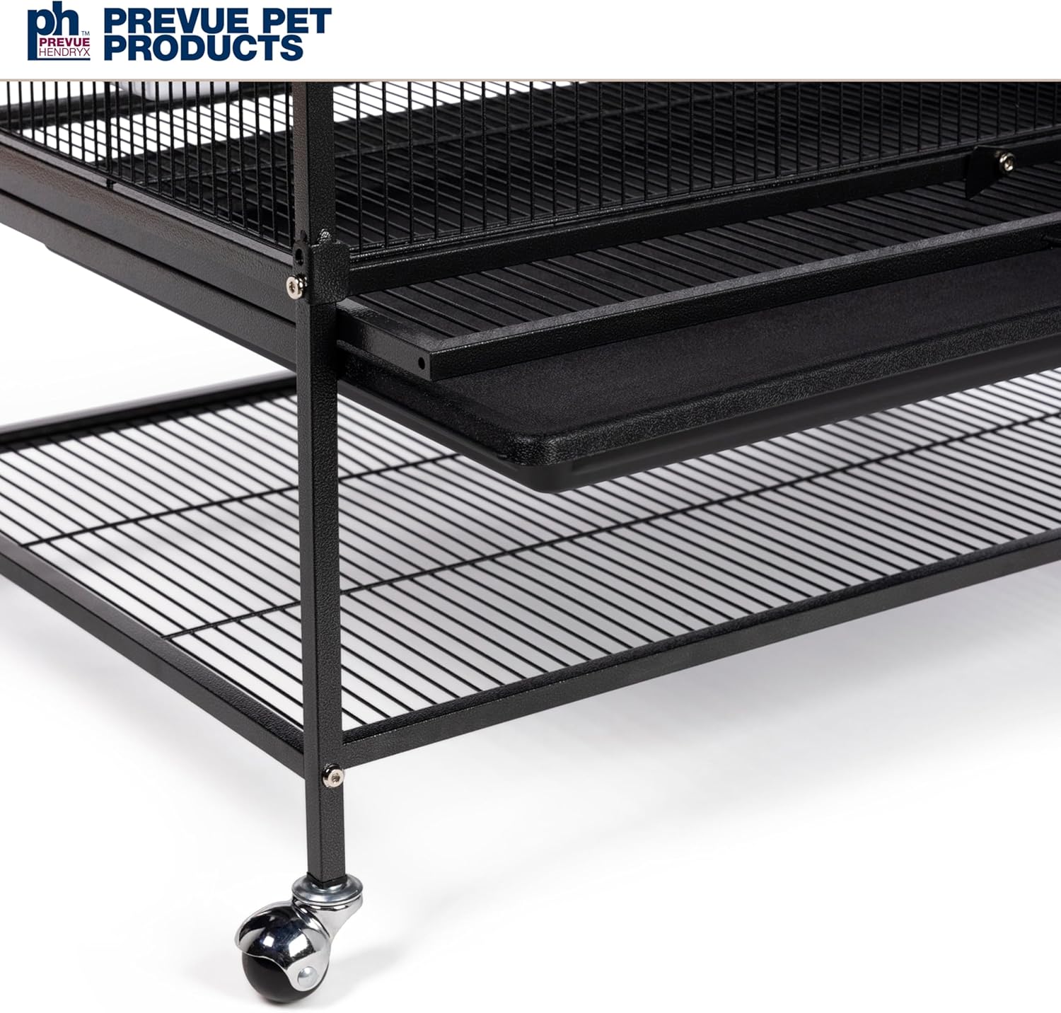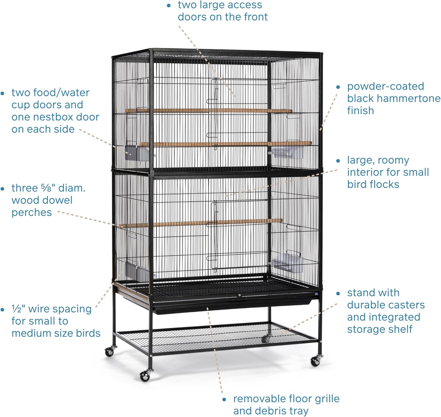 Our metal flight cage for birds makes the perfect home for multiple parakeets, canaries, finches, or other small to medium size birds. You can also use this animal crate for small parrots, cockatiels, and budgies. Showcase your beautiful feathered friends in this comfortable flight bird cage that’s easy to assemble and use. The powder-coated steel construction on this birdcage helps ensure it’s sturdy, durable, and reliable. Our black birdcage features two large front doors and a bottom shelf for additional storage space. The metal birdcage with storage helps keep the interior space neat, clean, and organized. Additionally, this flight cage stands on rolling casters. The cage wheels move easily so you can place your birdcage in any room. Inside, four plastic double cups and three wood perches help complete the economical extra-large bird cage set. This bird flight cage measures 31 inches long x 20 ½ inches wide x 53 inches high with ½ inch wire spacing. The interior space for pet birds is 30 ¼ inches long x 20 ¼ inches wide x 40 inches high. Our spacious flight crate home helps your bird use its natural instincts and abilities such as flying. The sleek, stylish dark hammertone finish matches any home design. Give your small pets a functional home that looks good but is easy to maintain. Our standing cage with accessories helps show the true meaning of balanced living and a “home sweet home.” Established in 1869, we’re on a quest to improve pet living and the pet ownership experience. Prevue creates stylish, functional, reliable, and pet-friendly products for domesticated animals and their families. Our products and accessories include toys, activity centers, crates, kennels, cages, and more. Simplify your life while improving your pet’s – with Prevue!