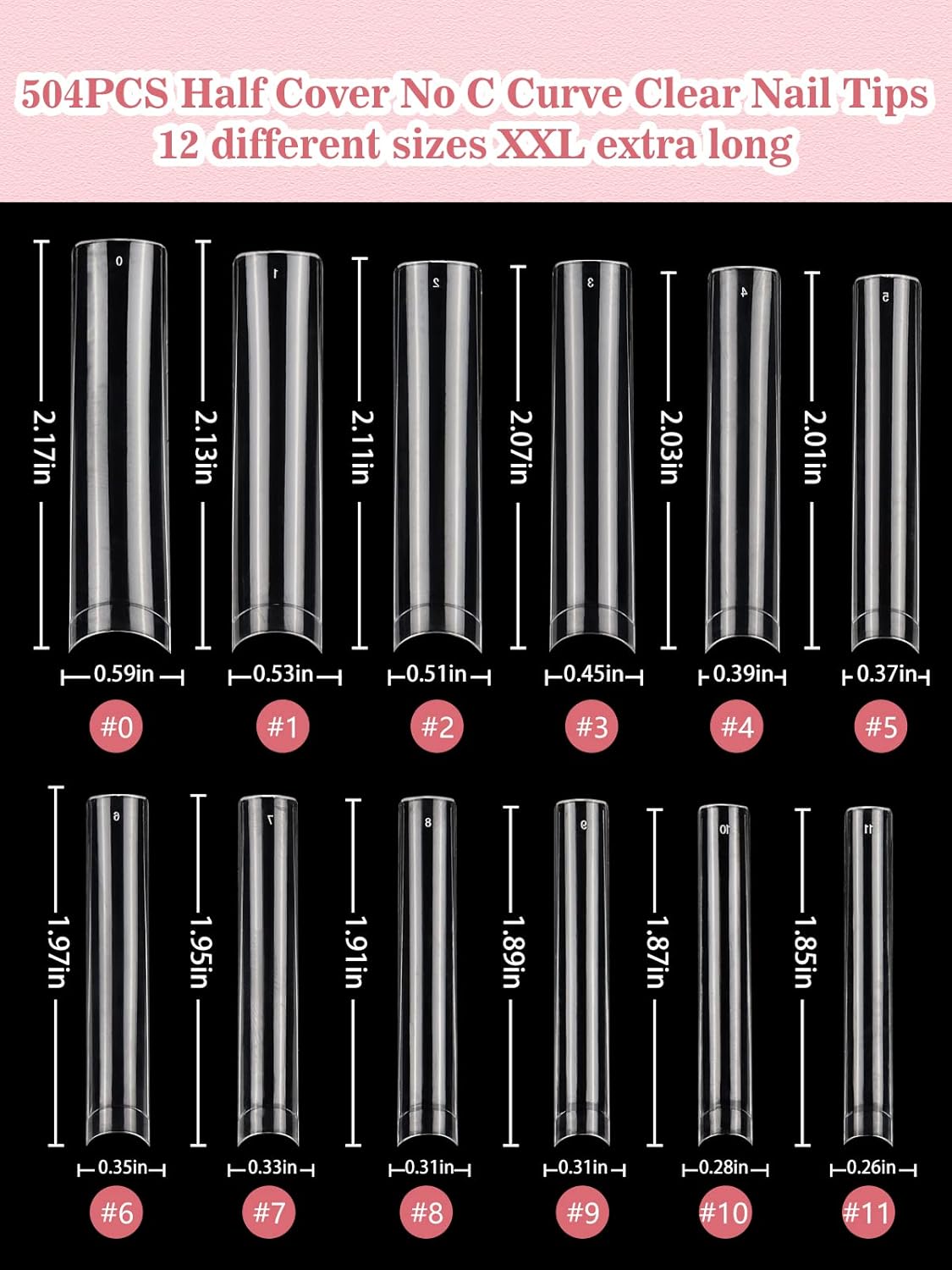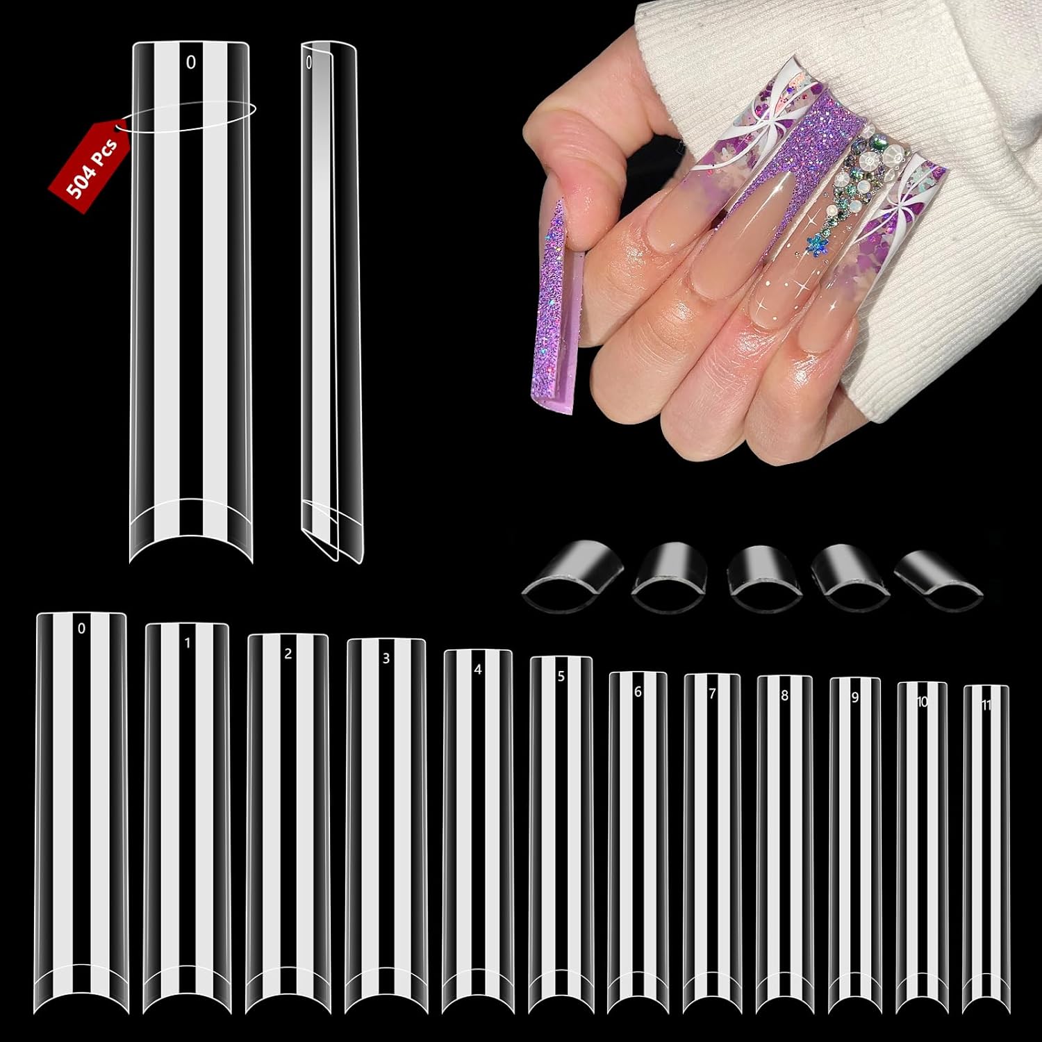 【504PCS & 12 Sizes】You will receive 504 pcs of nails,12 sizes with 42 pcs nails of each sizes, which is very suitable for nail salons and nail teches, this kind of professions with high demand for nails,Pre-numbered on each nail tip, you can easily get your desired nails. This straight square nail shape is also very popular and highly plastic.