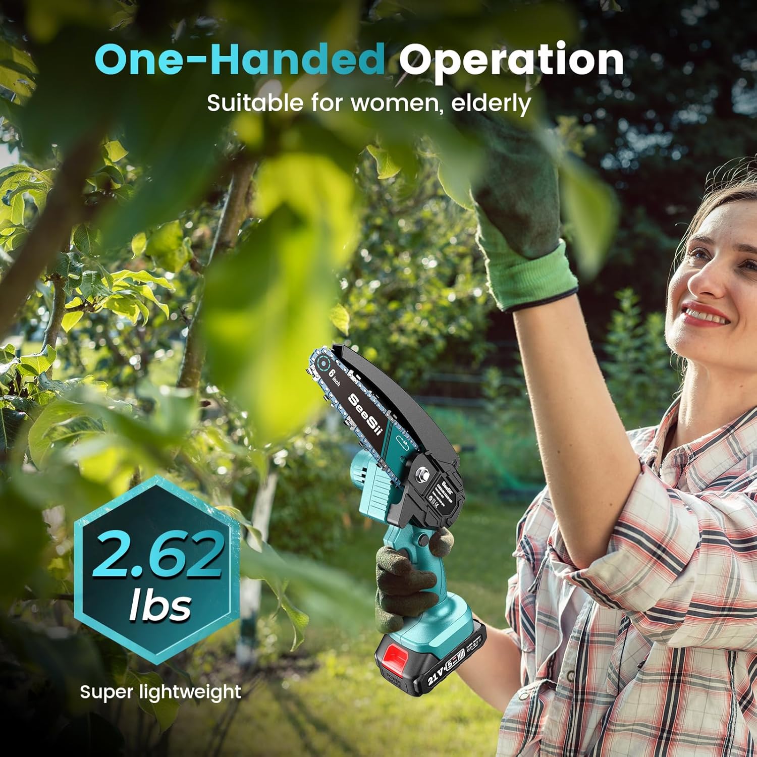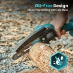 【ONE HAND USE CHAINSAW】Our lightweight battery chainsaw, just 2.62 lbs, is perfect for one-handed use without fatigue. Easy for beginners, its cordless design ensures portability in small spaces