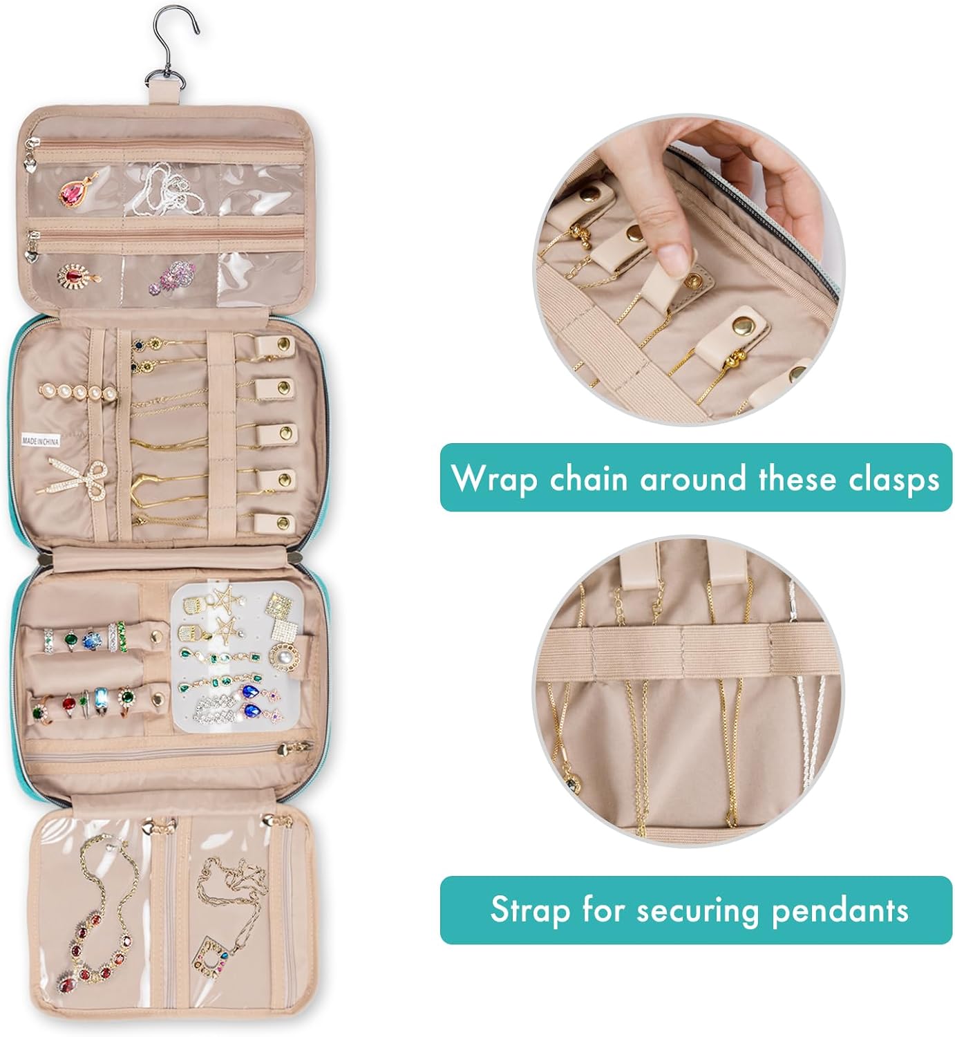 【More Compartments】: Buckle band for rings + earrings panel + necklace buckled strap + interlayer zippered pouch + side zippered pocket.