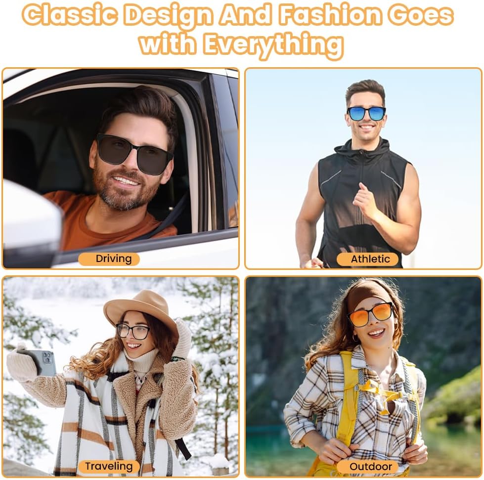 【Bluetooth 5.3+Touch Interaction|Stable and Convenient】 smart bluetooth glasses are equipped with the latest bluetooth 5.3 chip, 10 meters stable connection, strong anti-interference ability, no delay in call.Touch panel on the mirror leg, slide/click to adjust the volume, cut the song, answer the call No need to operate on the cell phone Convenient and fast