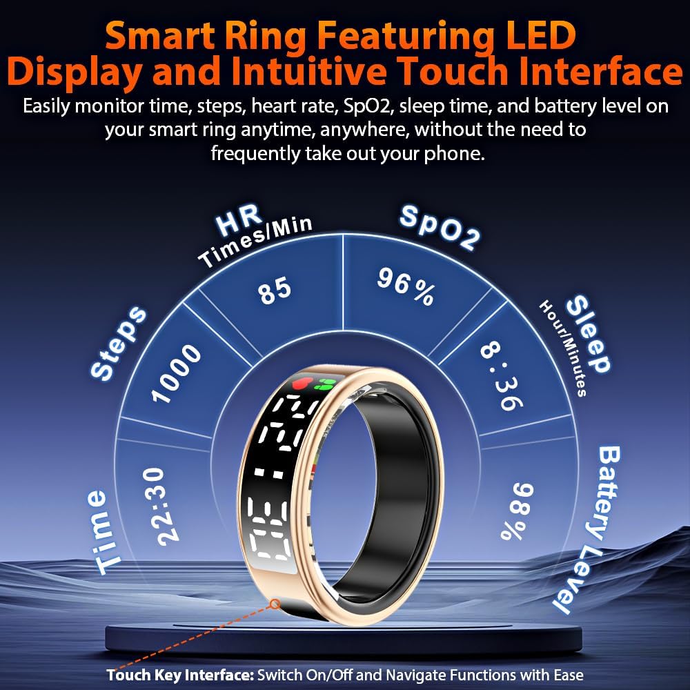 2025 Upgraded Smart Ring with LED Screen & Touch Button: Experience seamless device management with a high-definition LED screen and intuitive touch control. With a simple tap, you can effortlessly monitor essential data such as time, step count, heart rate, blood oxygen, sleep, and battery—without needing to constantly take out your phone. Designed for ultimate convenience, our smart ring is perfect for work, fitness, and leisure, adding a modern, stylish edge to your daily digital experience.