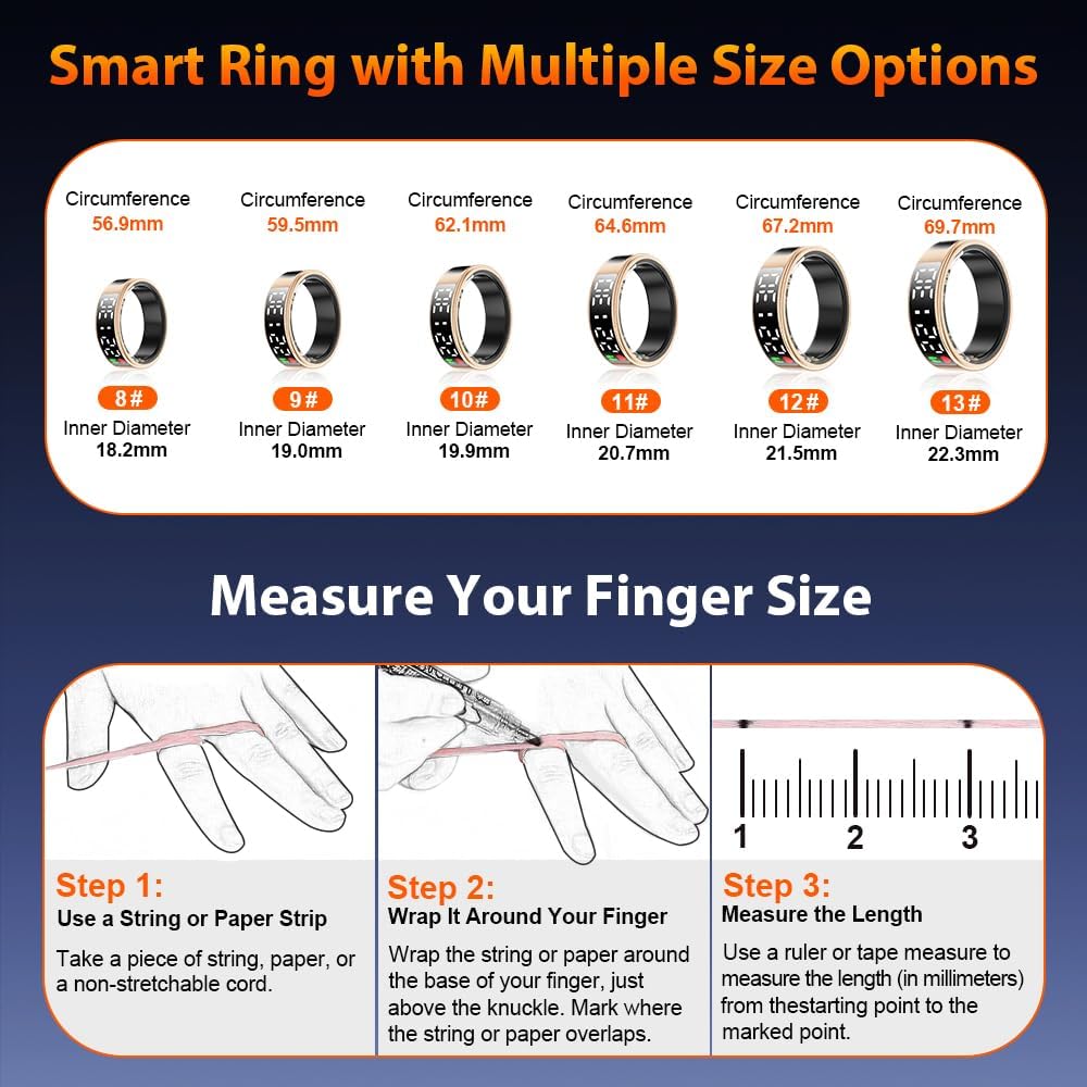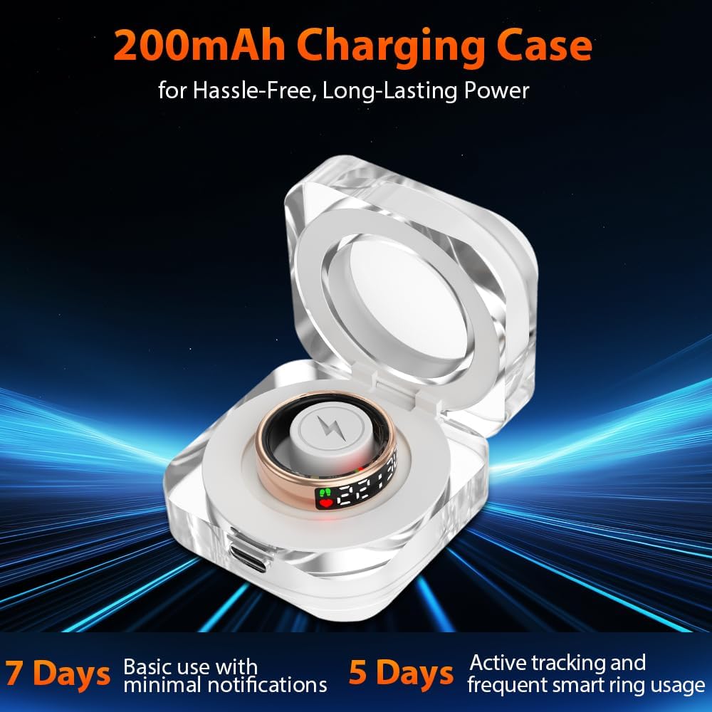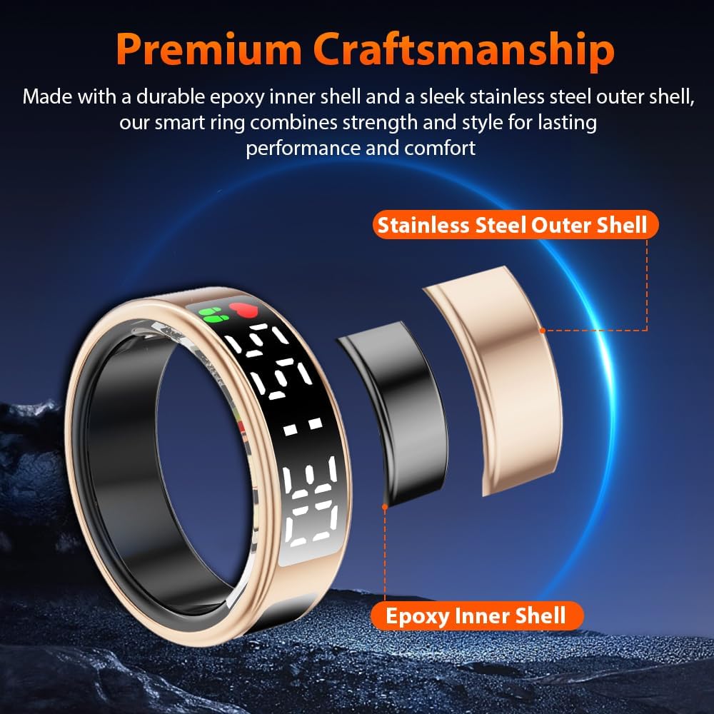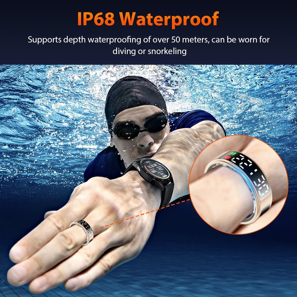 Premium Material & IP68 Waterproof: Crafted from high-quality epoxy resin and stainless steel, this ultra-light 4g smart ring is durable and comfortable to wear. With advanced sealing technology and an IP68 waterproof rating, it withstands water immersion, making it ideal for daily activities like hand washing, workouts, and even diving or snorkeling. Built for durability, its robust construction ensures long-lasting performance.