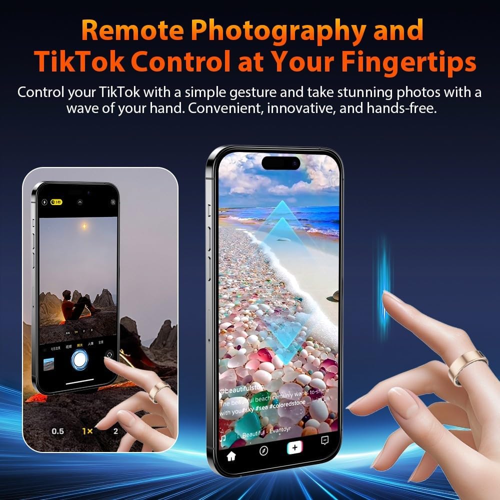 Fashion Smart Ring with Gesture Control for Apps: Enjoy easy control with air gesture functionality. Simply wear the ring and use gestures to browse TikTok, scroll through videos, flip pages in e-books, shop online, browse websites, or capture photos, providing hands-free convenience in daily tasks.