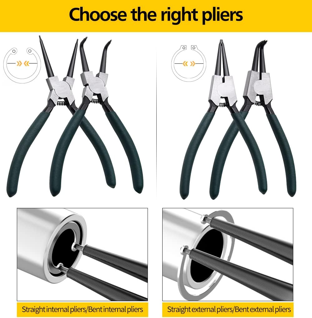 【Package Include】- The snap ring pliers set includes 4pcs 7″ internal/external circlip pliers, they are 1pc straight internal snap ring pliers, 1pc 90-degree angled internal snap ring pliers, 1pc straight external snap ring pliers and 1pc 90-degree angled external snap ring pliers