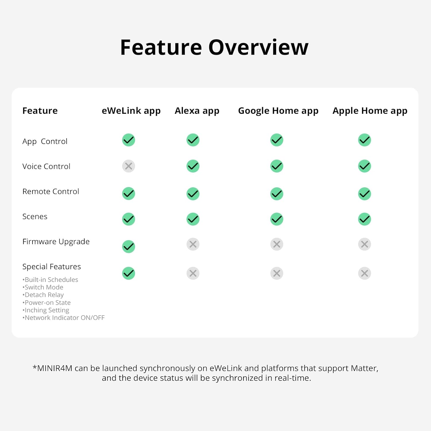 【Matter Compatible】SONOFF MINIR4M is a Matter-certified device, it can work with other brands of Matter end devices and integrate into Matter-enabled platforms, such as Alexa, Apple Home, Google Home, SmartThings,etc. Controlling all smart devices through one app is no longer a fantasy.