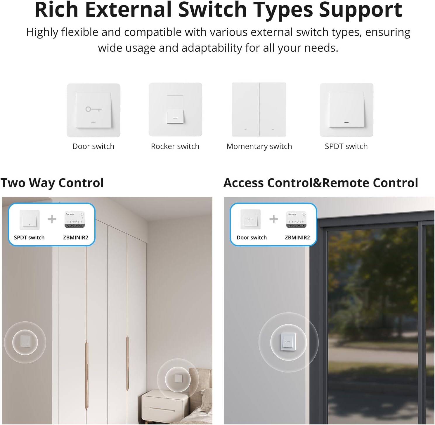 Compact & Versatile: 40% smaller than its predecessor, the ZBMINIR2 smart light switch makes installation easier. Supporting more external devices, the Zigbee switch can be integrated into various types of switches, including Rocker switches, Momentary switches, SPDT switches, Door switches, and more