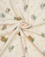 Off-white baby blanket has a printed side and solid, textured side. Solid binding offers a durable finish