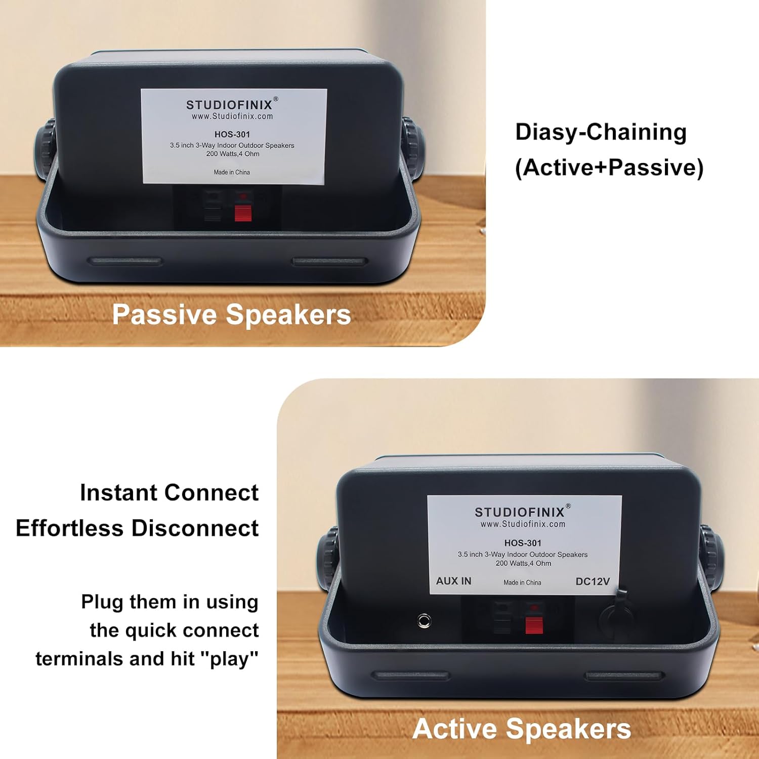 【3.5mm Aux Input Jack】The outdoor wired speakers has a built-in AUX 3.5mm input jack so you can connect additional external devices to your speaker system, such as mobile phone, laptop, computer, home theater, television, CD player,offering a seamless audio experience across multiple devices.