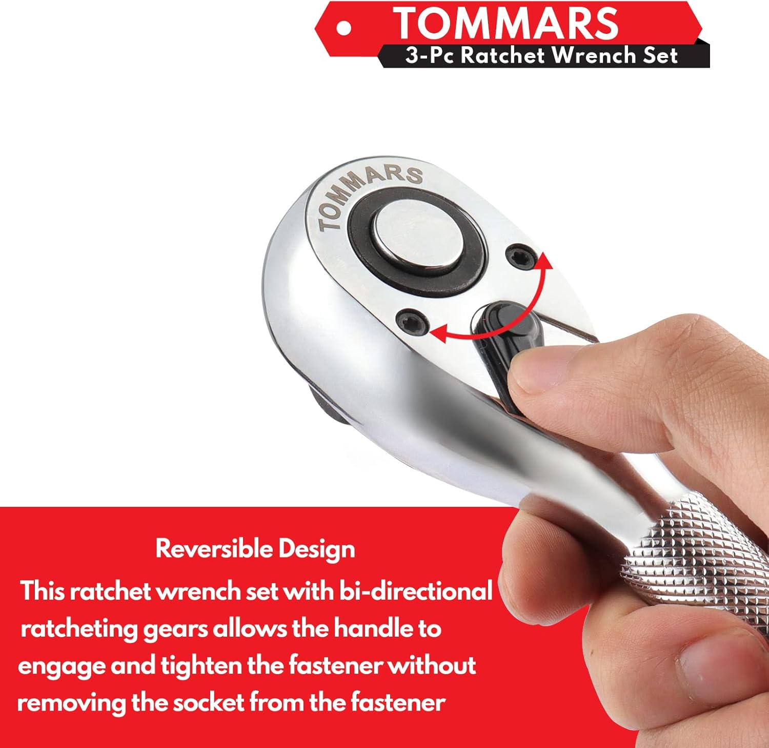 The ratchet head has a reversible 72-tooth gear that only needs a 5-degree swing arc to operate. The quick-release reversible head design allows you to replace the socket by simply touching the middle part, and you can change the driving direction by flipping the biased drive switch.