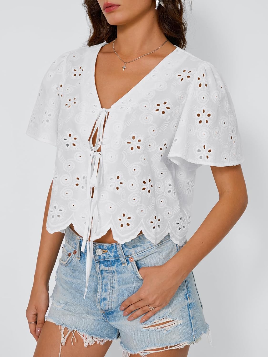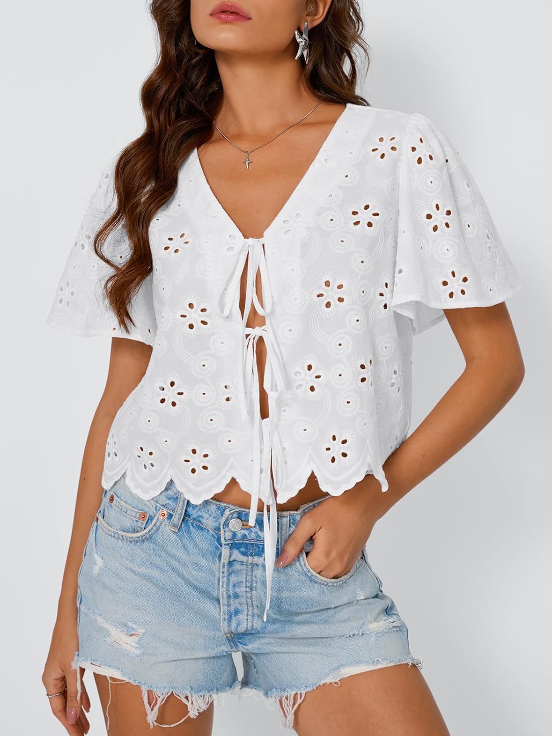 Trendy Queen Womens Tie Front Tops Summer Beach Vacation 2025 Fashion Outfits Short Sleeve Blouses Eyelet Embroidered Clothes