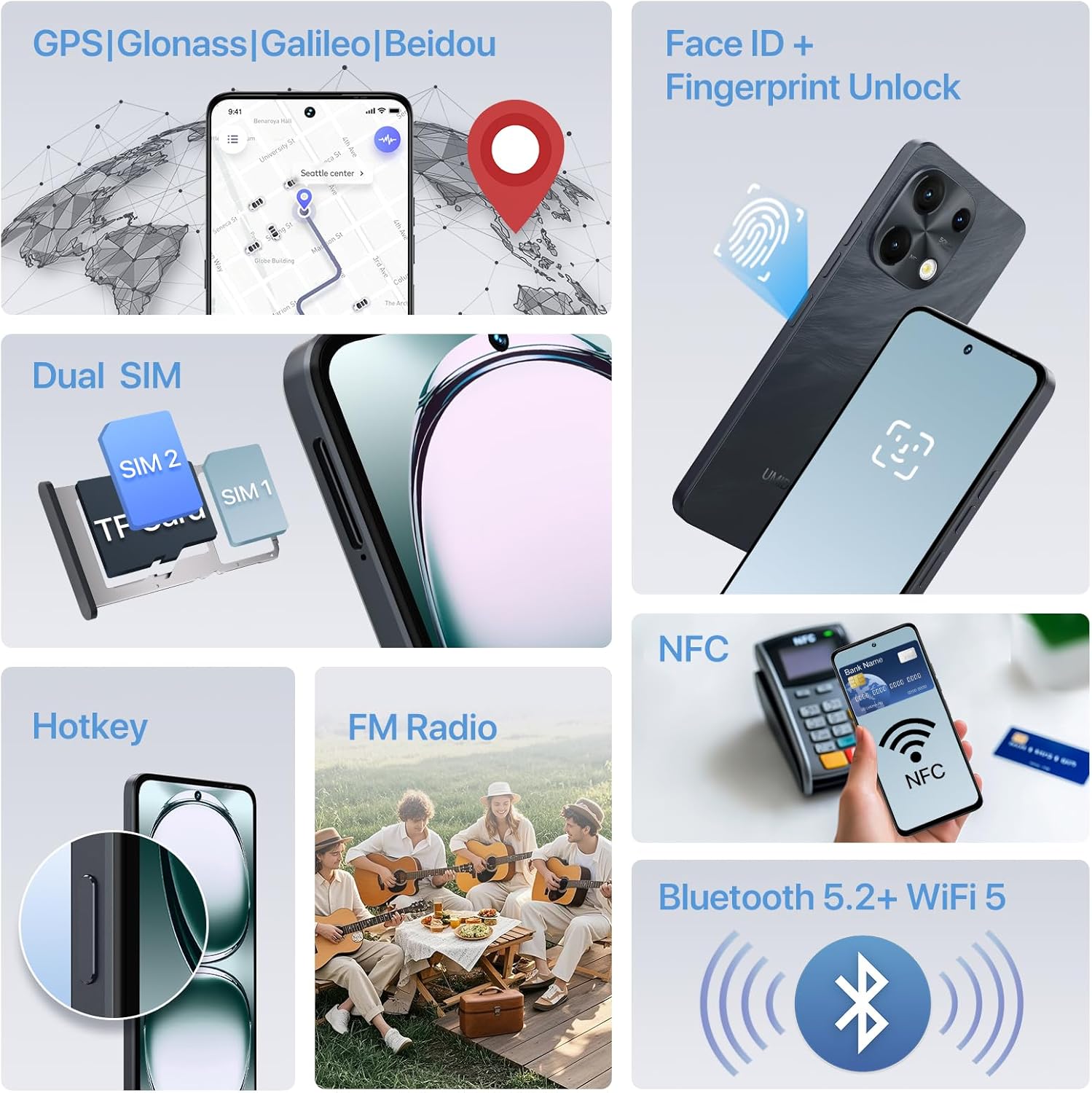 𝐎𝐭𝐡𝐞𝐫 𝐅𝐞𝐚𝐭𝐮𝐫𝐞𝐬: This Unlocked phones has a 3.5mm headphone jacksupport face and fingerprint unlocking. Compatible with NFC,FM radio, OTG functionality. Bluetooth version 5.2. Built-in GPS, GLONASS, BeiDou and Galileo. Easy to use, very practical.