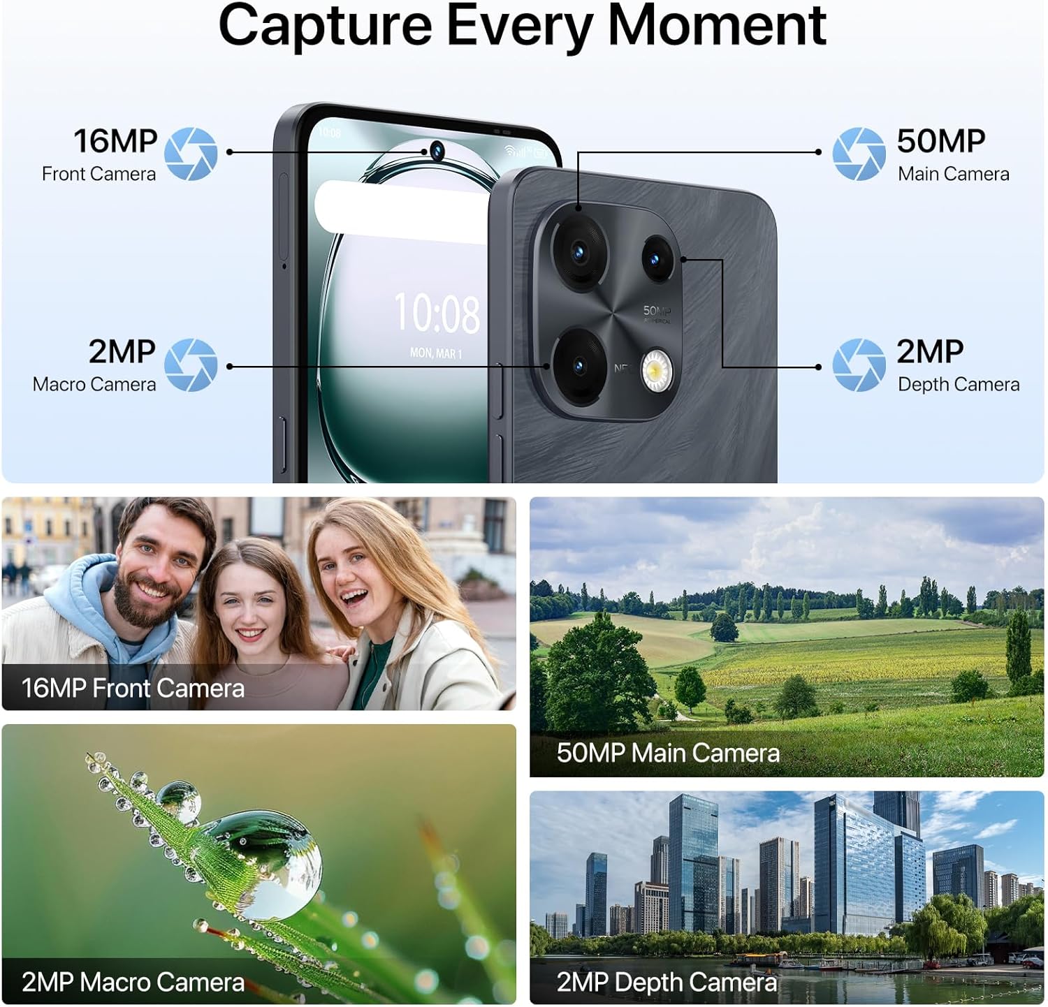 𝟓𝟎𝐌𝐏 𝐌𝐚𝐢𝐧 𝐂𝐚𝐦𝐞𝐫𝐚+𝟏𝟔𝐌𝐏 𝐅𝐫𝐨𝐧𝐭 𝐂𝐚𝐦𝐞𝐫𝐚: The UMIDIGI Note 100 unlocked smartphone comes with a 50MP main camera, 2MP macro lens, 2MP depth camera and advanced image processing technology, the 16MP front camera that captures stunning selfies and makes HD online calls as ease, meet your individualized needs in different scenarios.