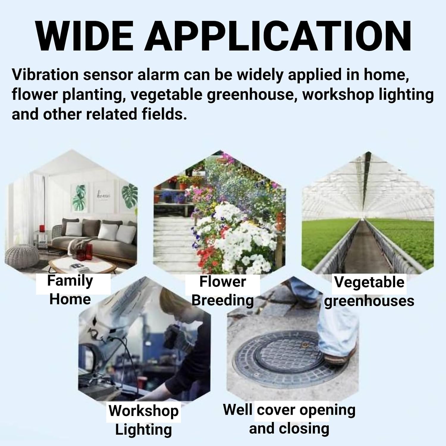 APPLICATION: Vibration sensor alarm can be widely applied in home, flower planting, vegetable greenhouse, workshop lighting and other related fields, widely used in your work and life