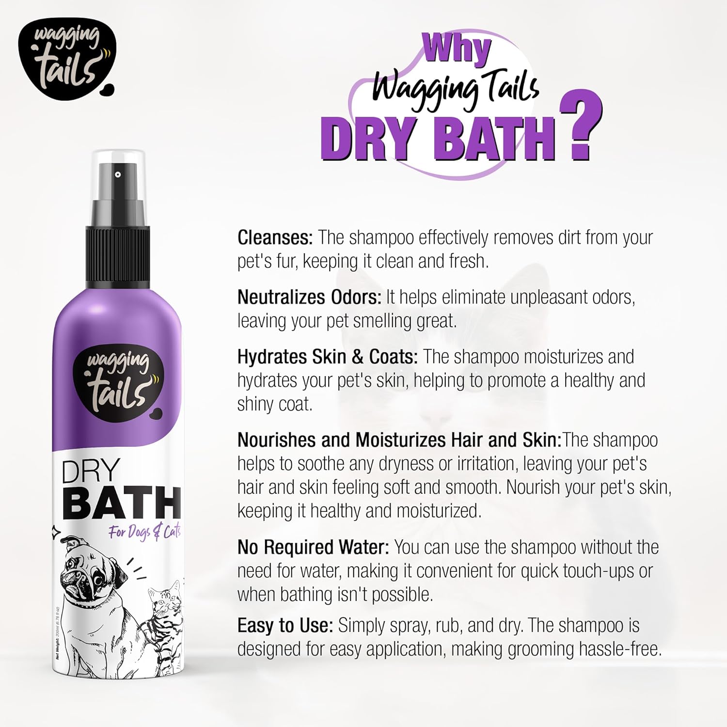 Wagging Tails 6-in-1 Waterless Dry Bath Shampoo for Cats & Dogs, 6.76 fl oz | Waterless Deep Cleaning Pet Spray | Easy to Use | Neutralizes Odors | Moisturizes & Nourishes Coat, Hair, and Skin