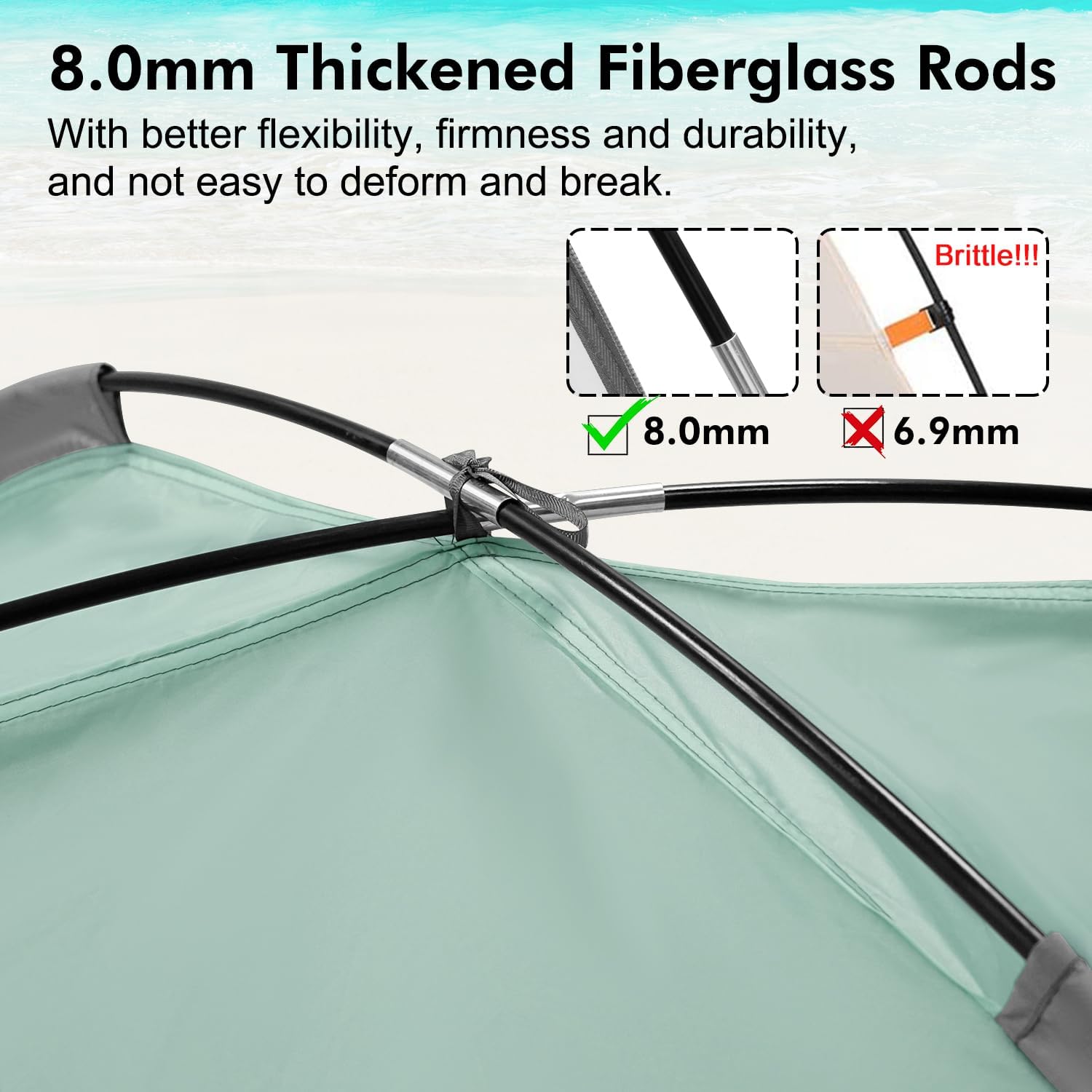 8.0mm Thickened Fiberglass Rods: We increased the thickness of the fiberglass rods to 8.0mm to make it more flexible, sturdy and durable. It can support the tent more stable and will keep shape even after long time use.