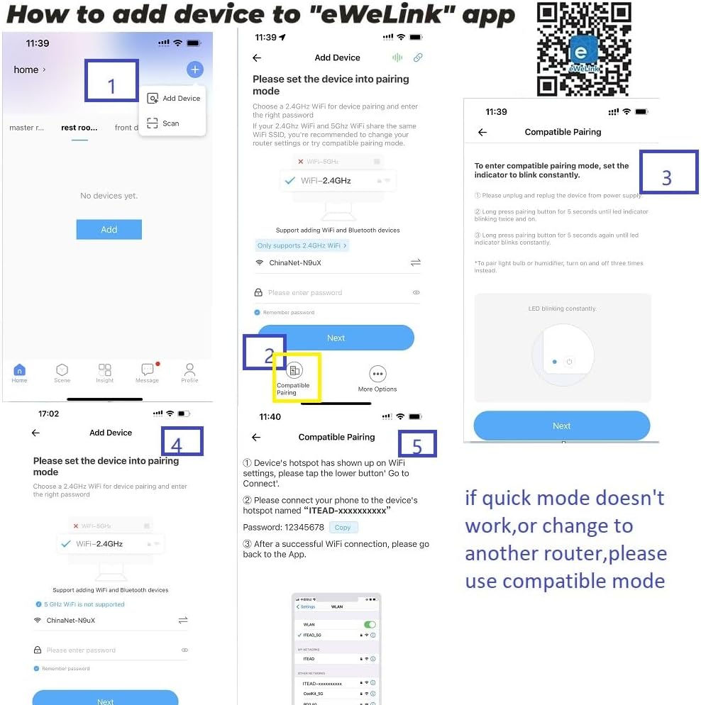 Easy to Hook up,Low Power Smart Home Remote Controller ,Add WI-FI to Your Garage Door Opener,Power it with DC 5-32V,Control your door by your phone anywhere,and share the remote control to your family.please noted it support 2.4G WIFI ONLY,If quick mode doesn’t work,please use compatible mode to pair with ewelink