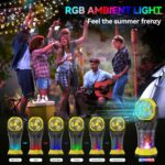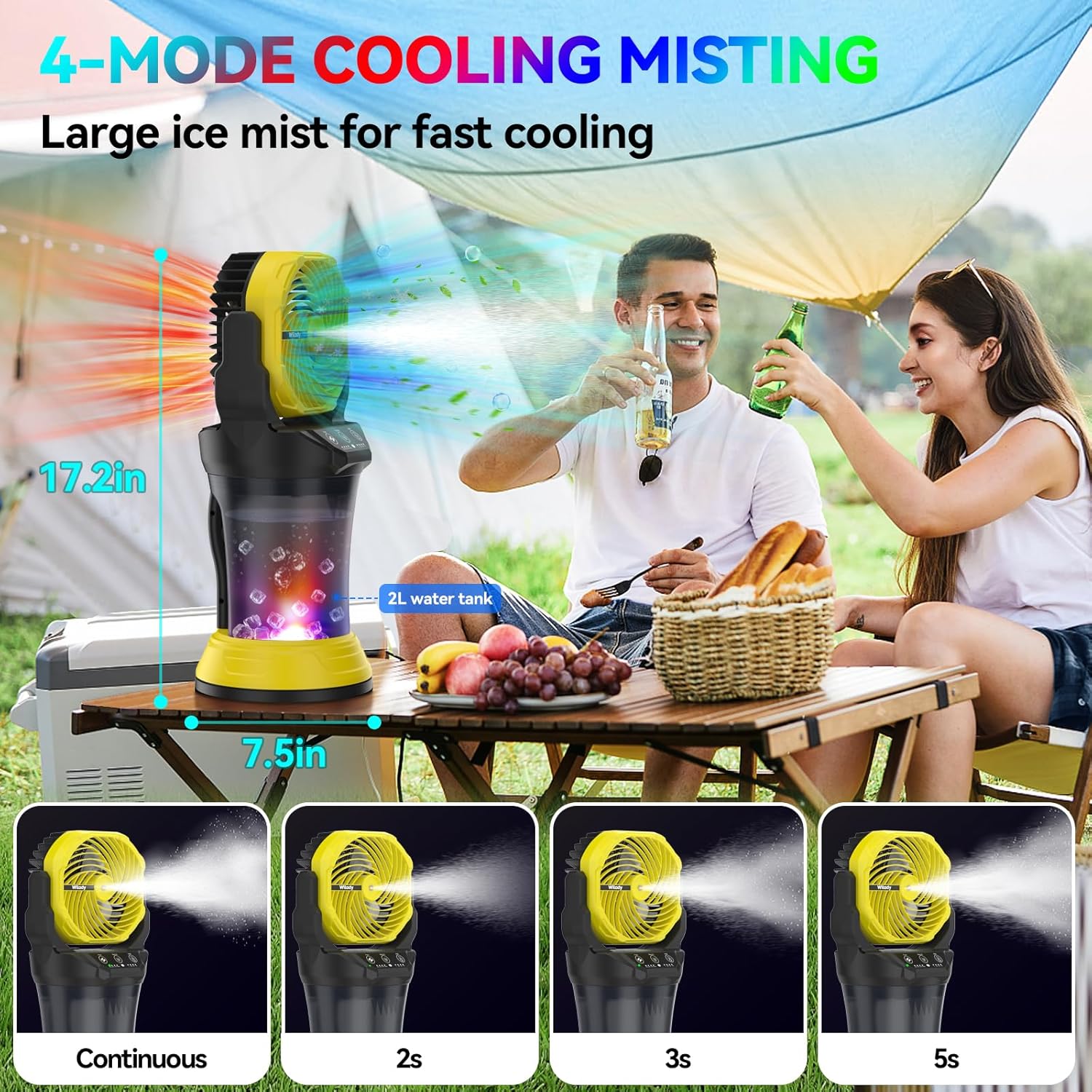 Wilody Misting Fan Portable Camping Fan 42800mAh Battery Powered with Remote Control, RGB Ambient Light with 2L Bucket, Battery Indicator, 120° Auto Oscillating, Timing Function, Grip Handle
