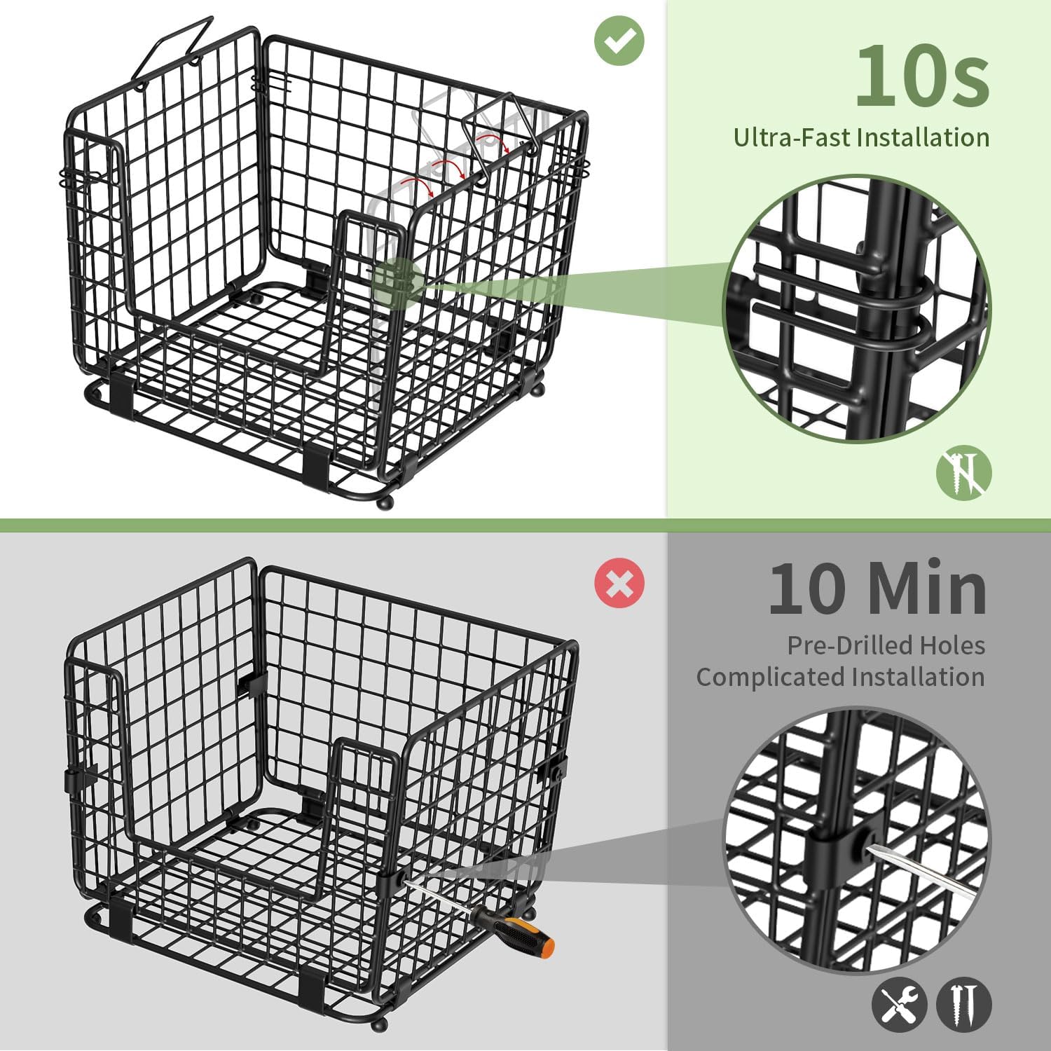 10S QUICK INSTALLATION: This wire storage basket can be easily and quickly installed in 10s, no screws and no tools required. In order to save your time, the buckle is pre-installed. Simply connect the basket using the built-in buckle, then install the removable lid.