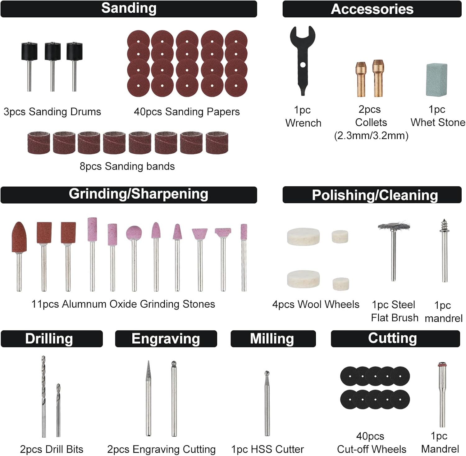 Perfect for Kinds of Materials: The cordless rotary Tool kit includes 114 accessories in total, with grinding stones, sanding pads, felt wheels, mandrels, and much more. It comes with two sizes (3/32″ & 1/8″ ) of universal chuck, allowing you to change accessories on the Rotary tool quickly and easily. The number and variety of accessories make this tool perfect for crafters working with many materials. All accessories can easily be stored in a plastic case