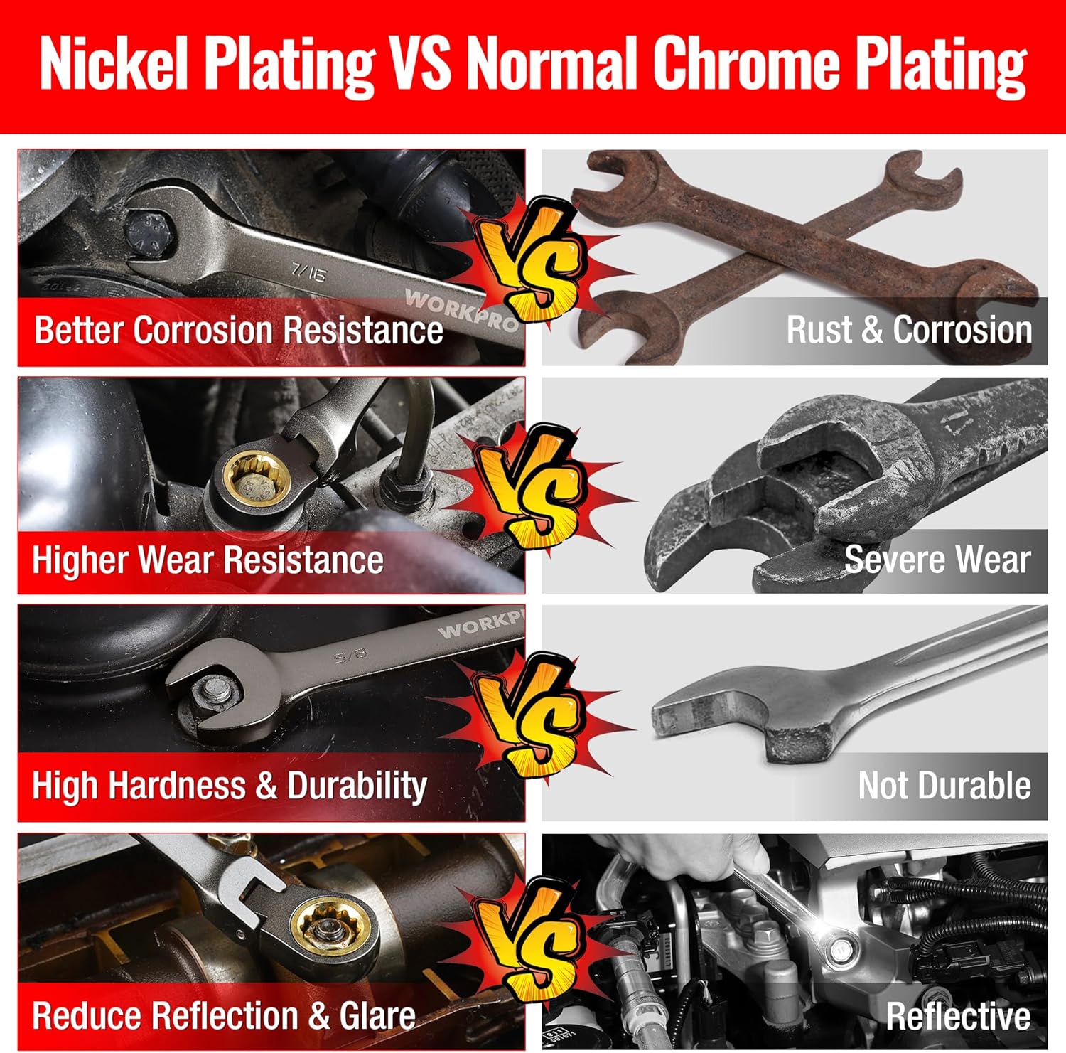 Our ratchet wrenches are made from high-quality heat-treated CR-V alloy and nickel plated for durability