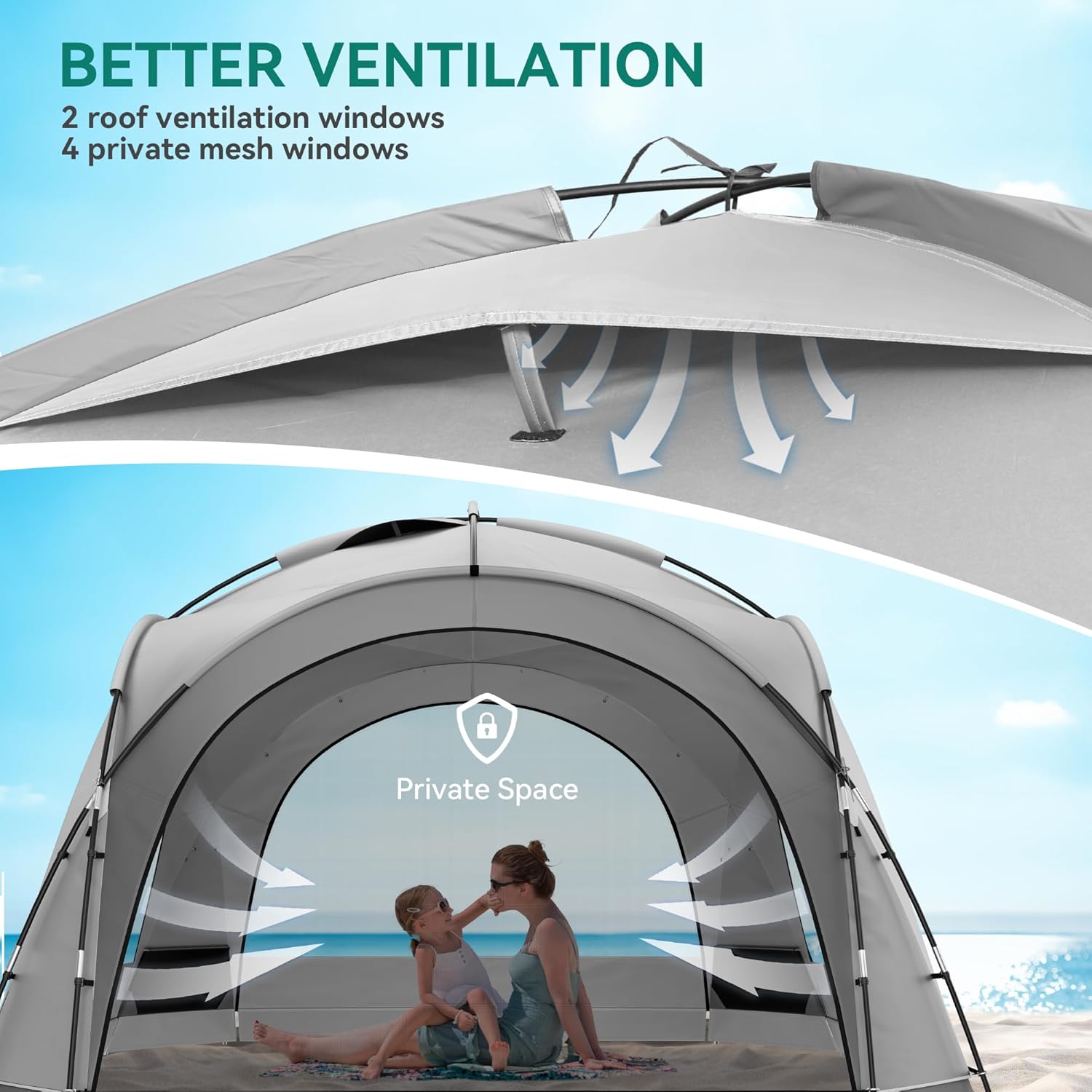 GREAT VENTILATION – The beach tent is designed with hanging cloth to provide more private space, the top is equipped with ventilation holes, which not only improve air circulation within the sun shade but also help maintain canopy stability through airflow