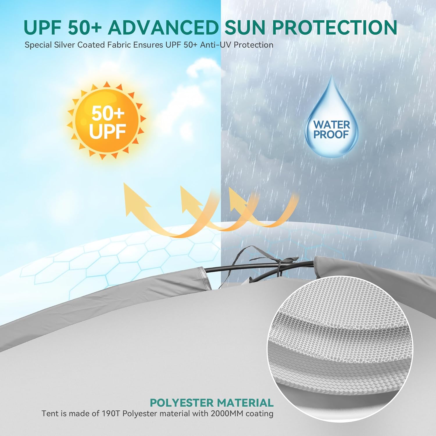 SUPERIOR MATERIAL – Crafted with PU 2000mm advanced silver-coated water-resistant fabric and offering UPF 50+ sun coverage, our sun shelter for beach and outdoor use blocks out harmful UV rays to reduce sunburn or glare, making it ideal for friends or family to lay out