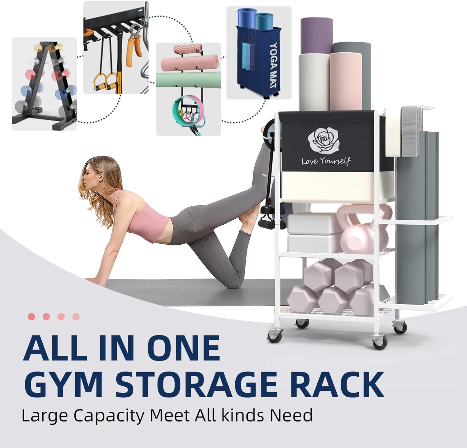 Store Various Exercise Equipment-This home gym storage rack is incredibly versatile, perfect for stowing all your essential workout gear. From yoga mats to free weights, everything finds a home with our smart design including foam rollers, yoga bolsters, small exercise balls, yoga blocks, dumbbells, light kettlebells, resistance bands, yoga straps, jump ropes, yoga wheel and so on