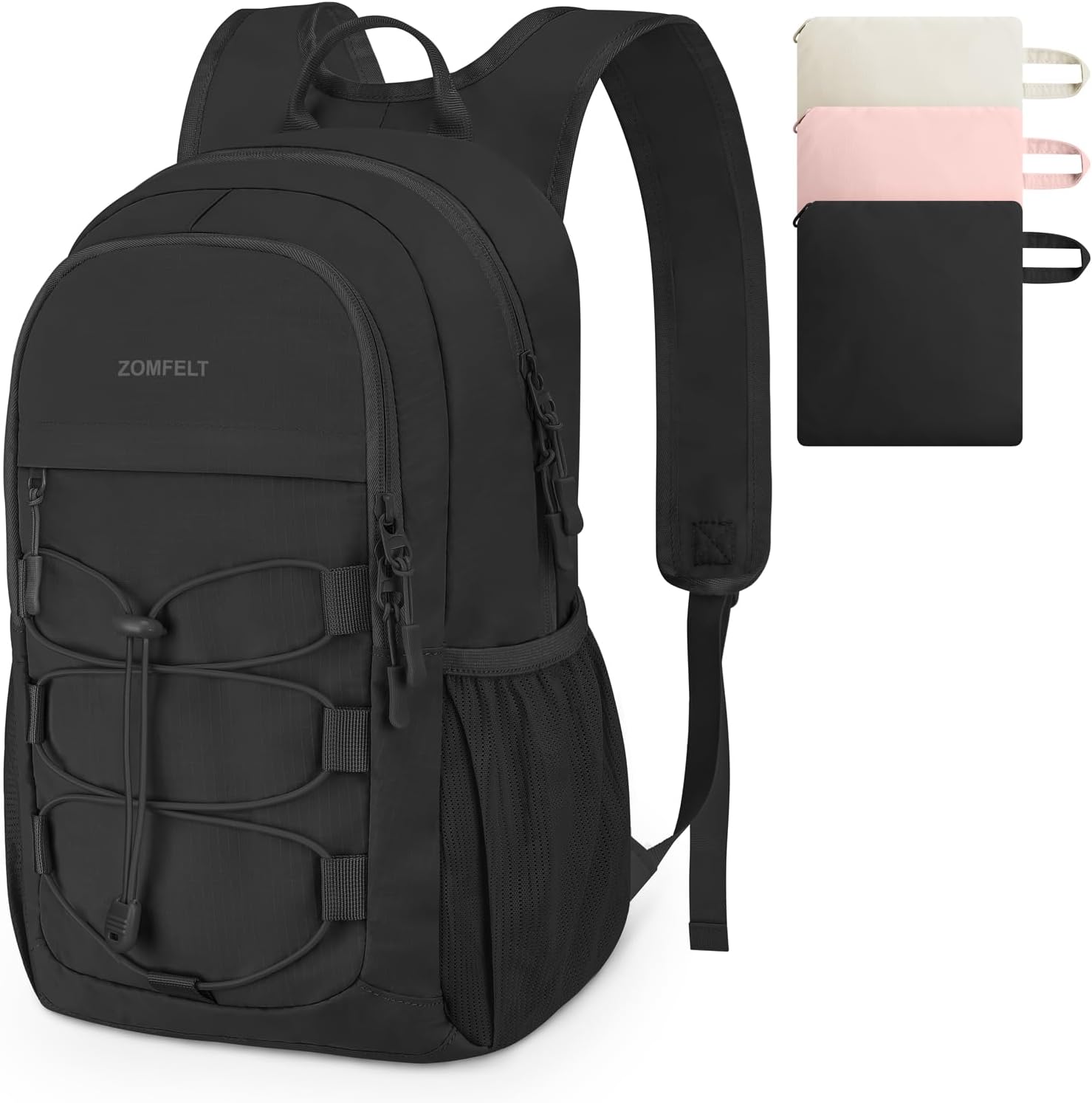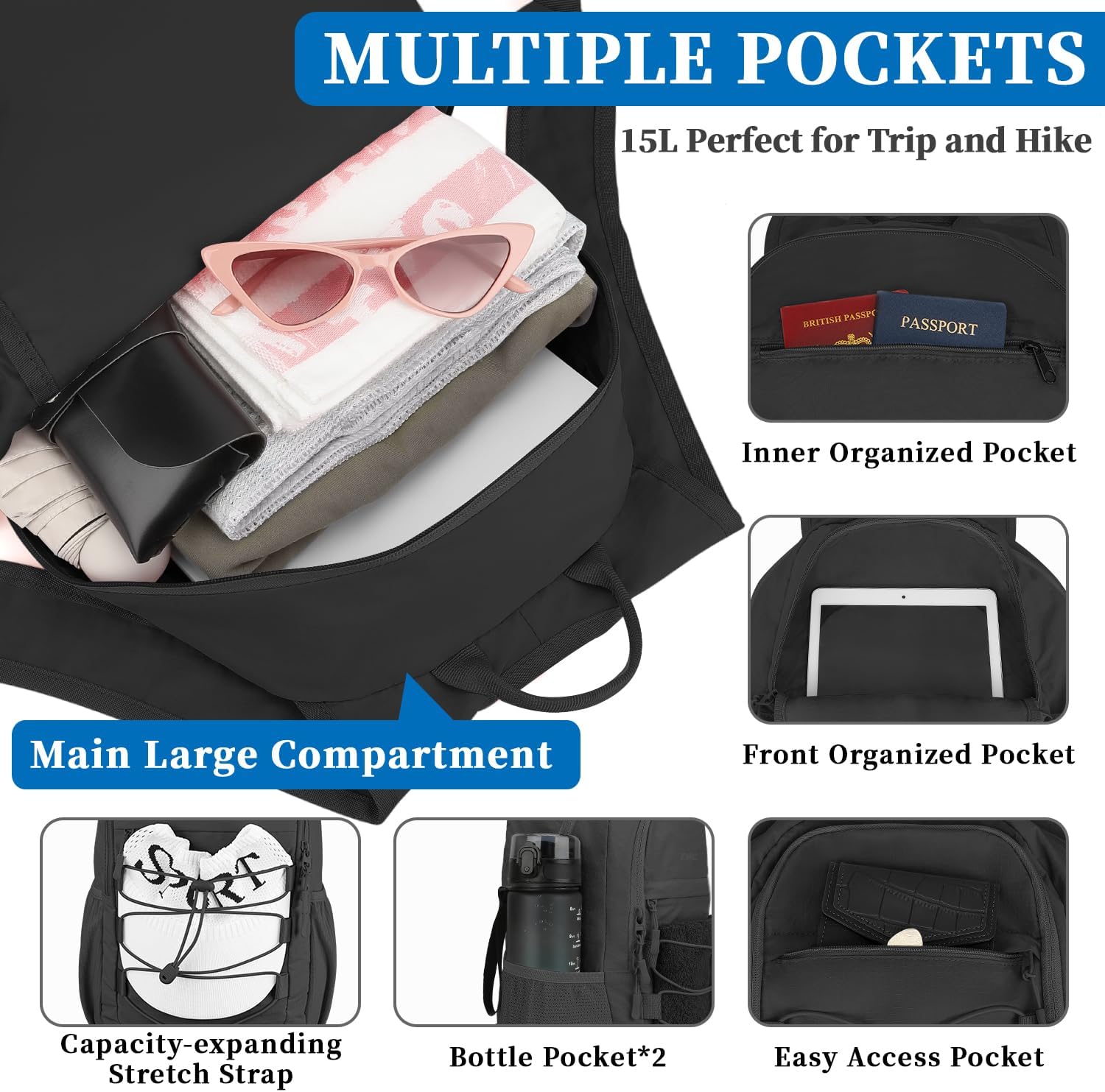 Compact Yet Spacious: This hiking backpack for women combines minimal size with maximum practicality. The 15l main compartment and zippered interior pocket can hold your travel and hiking essentials. Two quick-access front zippered pockets hold your phone, portable charger and more. Two side pockets can easily accommodate large water bottles and umbrellas. An elastic drawstring stores items such as hats or sports protective gear